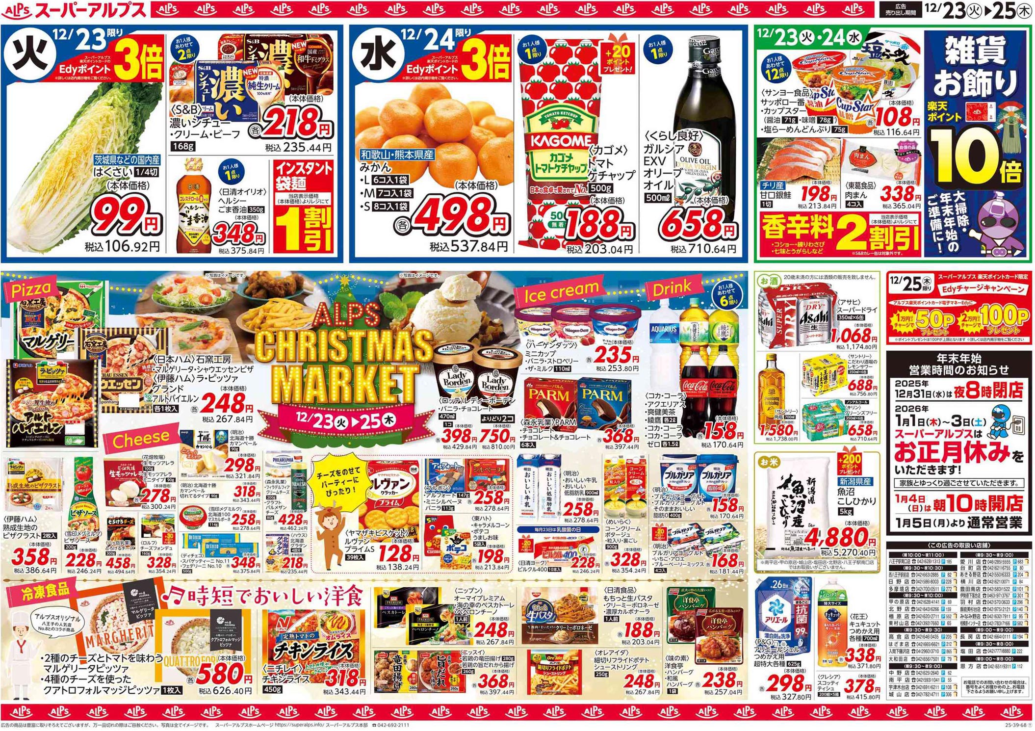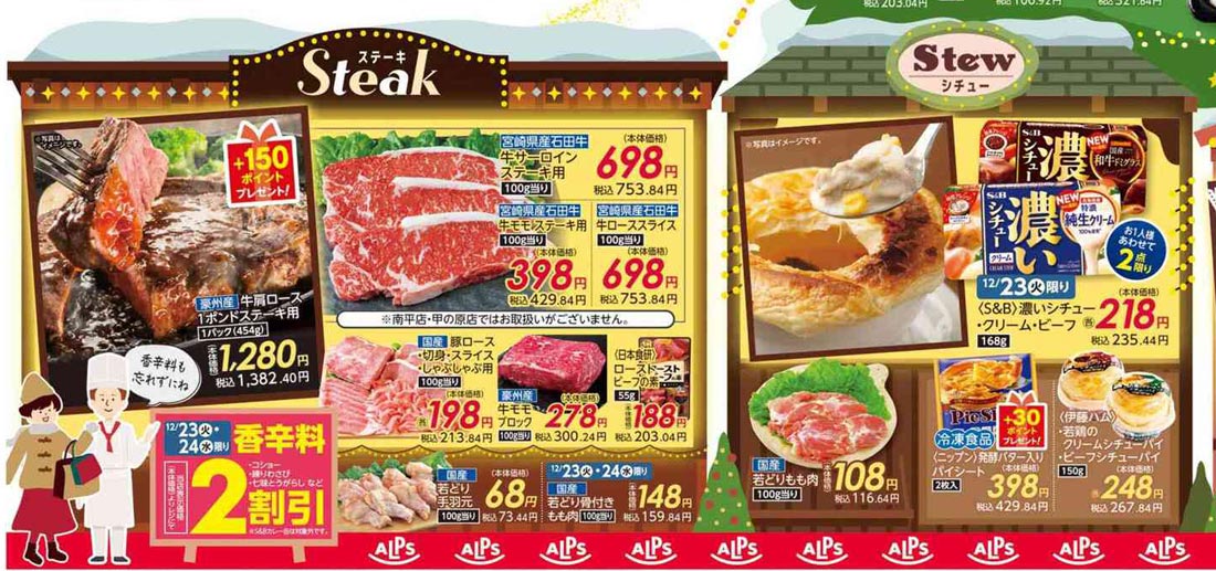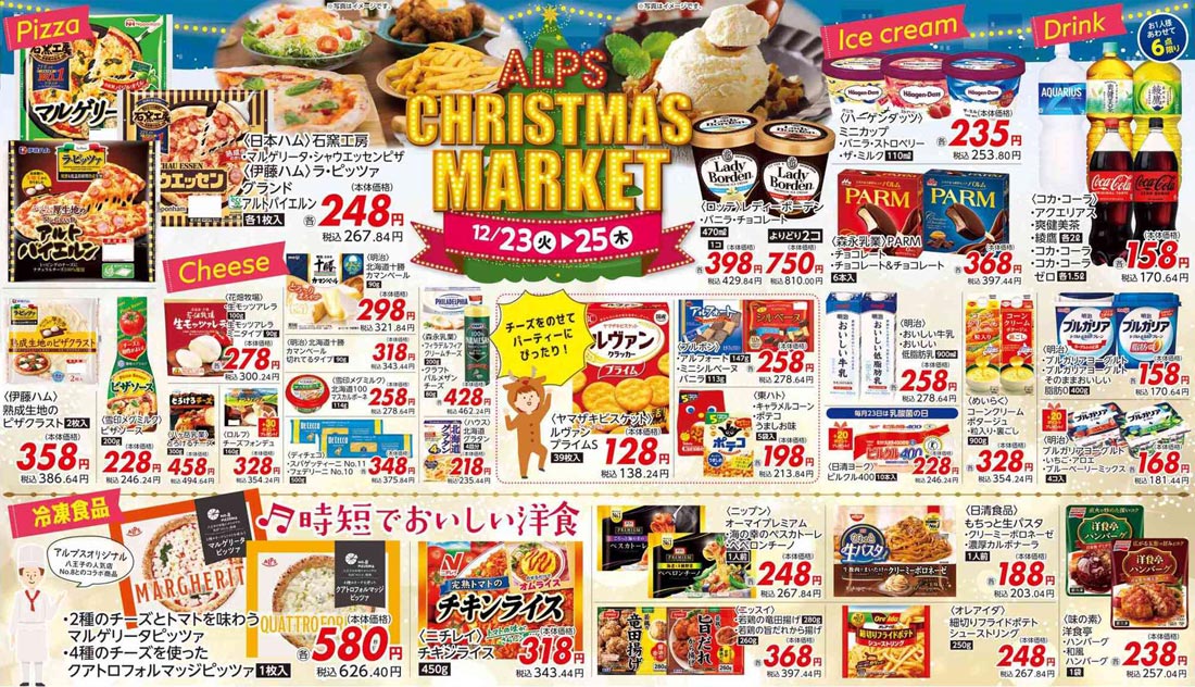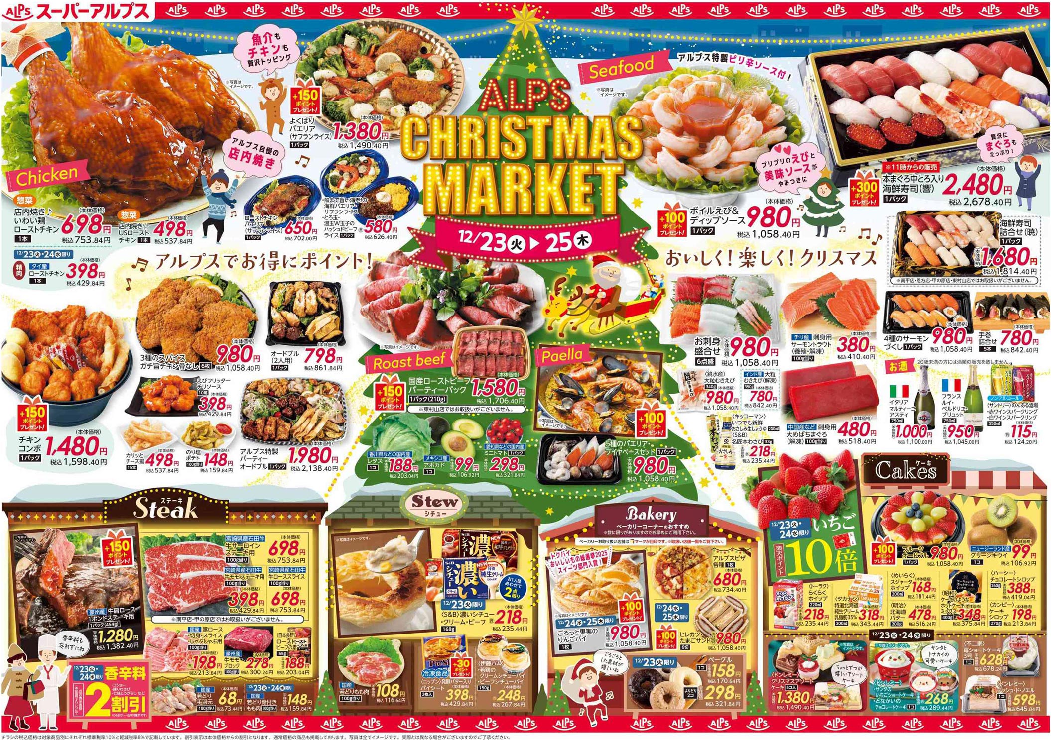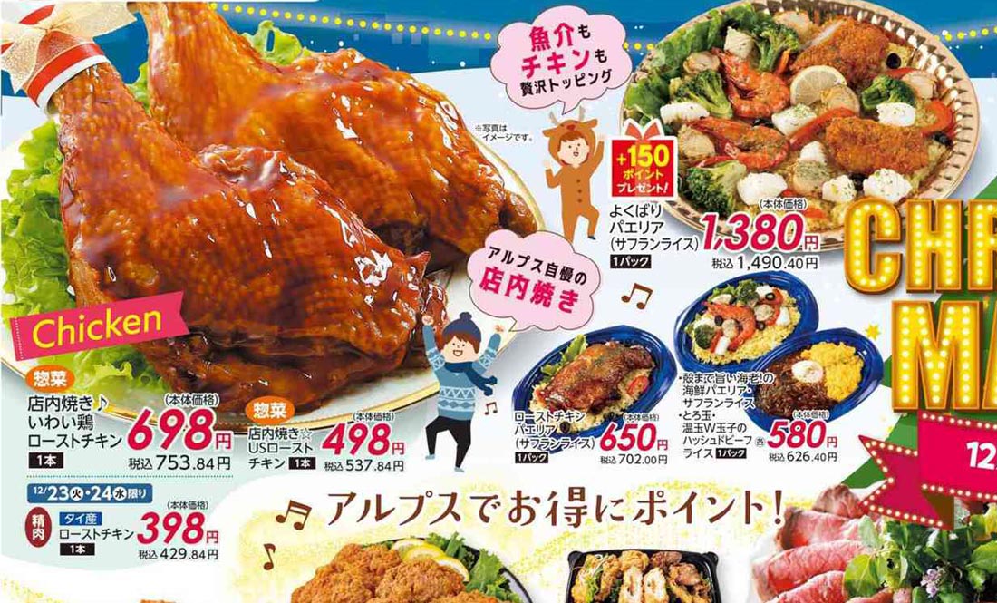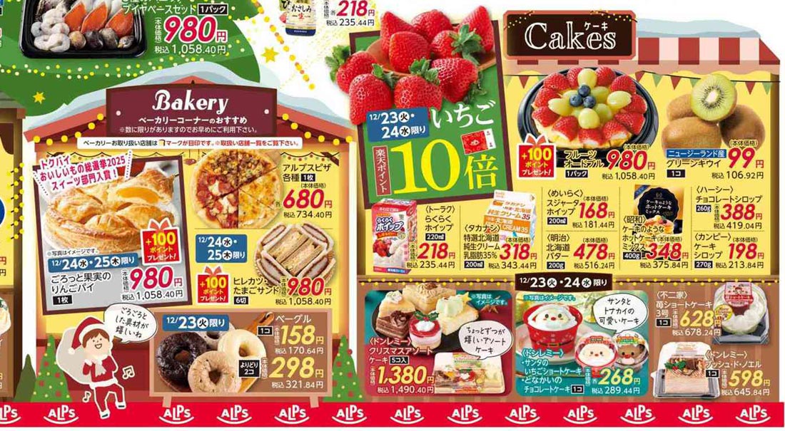 アルプス2025年12/23号(食品スーパー)のチラシ内容を紹介します。クリスマスを中心に、ポップな要素とゴシック系・イラスト使用の表現で構成されたデザインです。