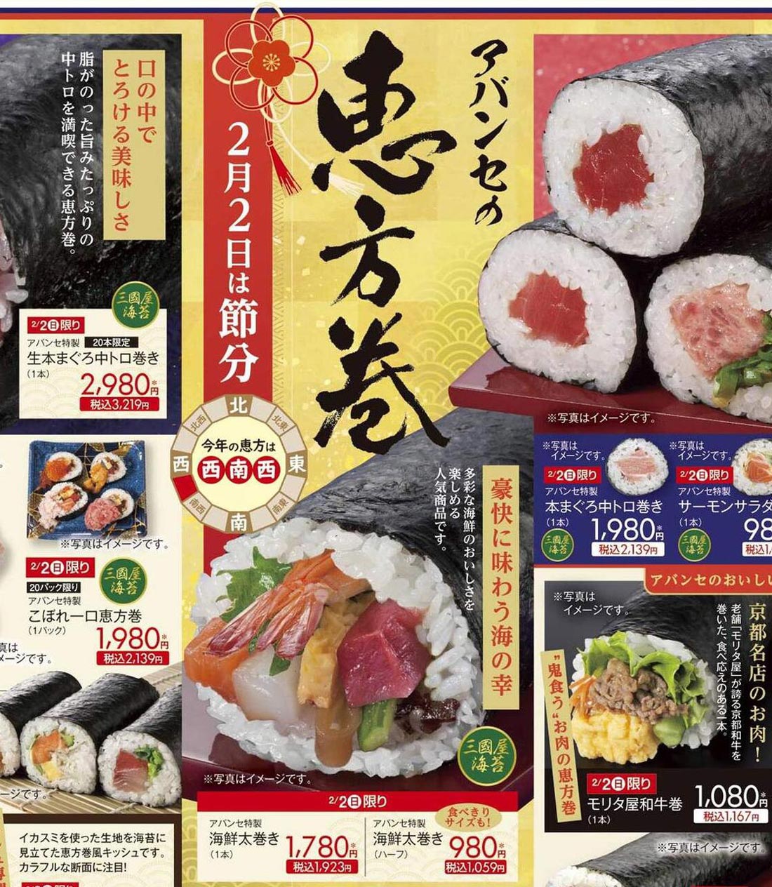 アバンセ2025年2/1号(食品スーパー)のチラシでは、その他・恵方巻をテーマにした構成が採用されています。シンプル・和風な印象と手書き・筆のデザイン表現が特徴的です。