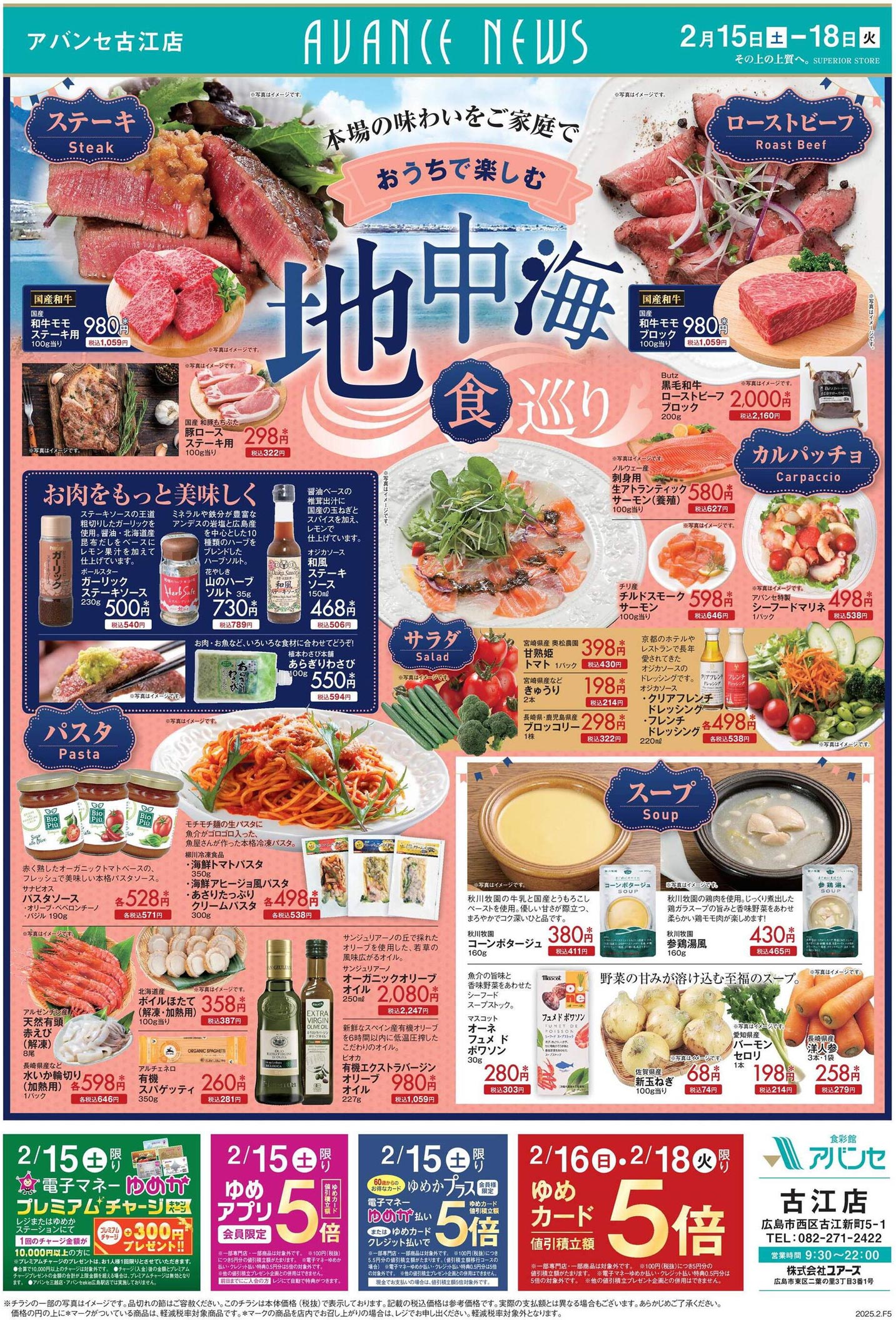 アバンセ2025年2/15号(食品スーパー)のチラシ内容を紹介します。K 海外を中心に、さわやか・スタイリッシュな要素と明朝系・写真使用の表現で構成されたデザインです。