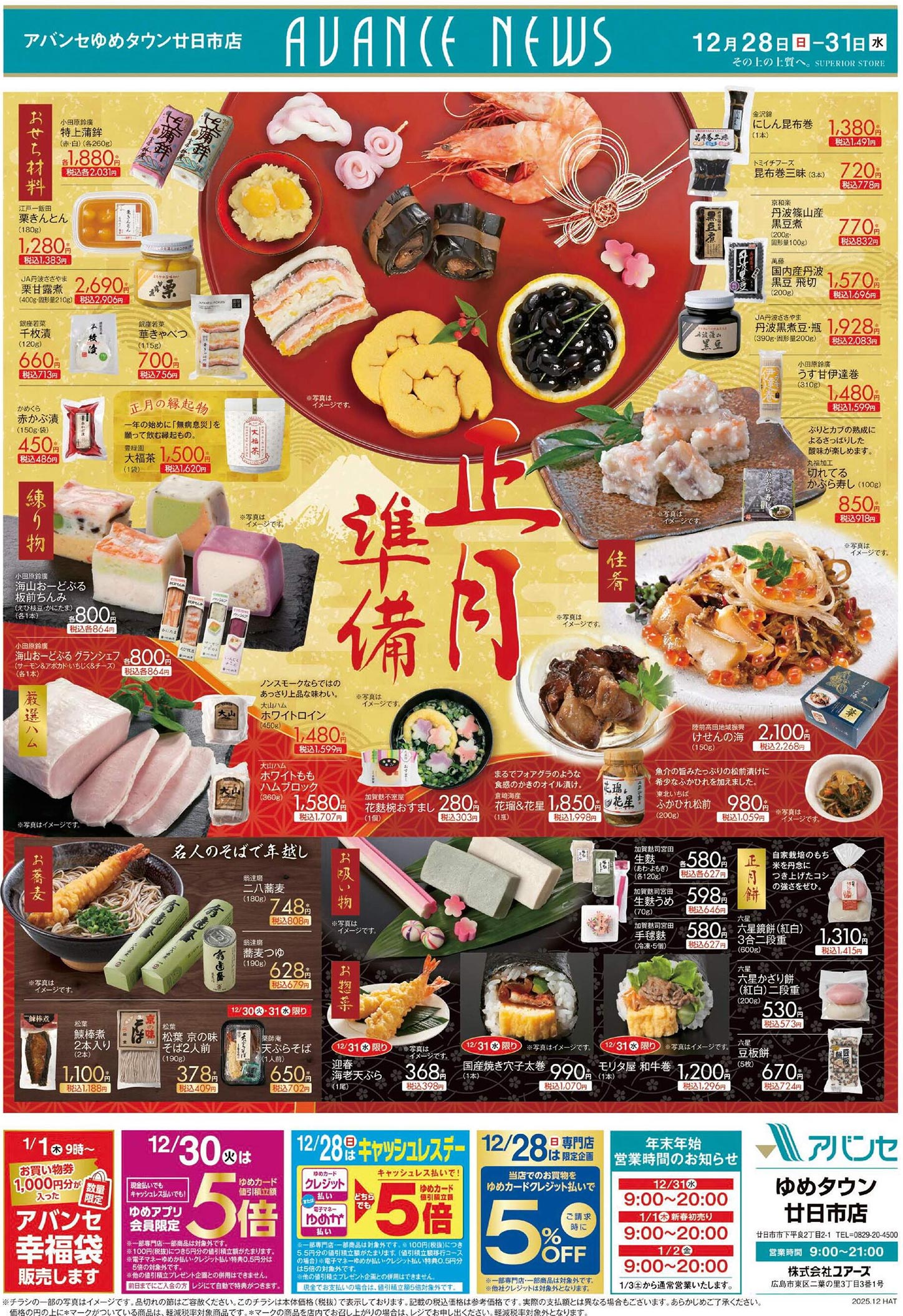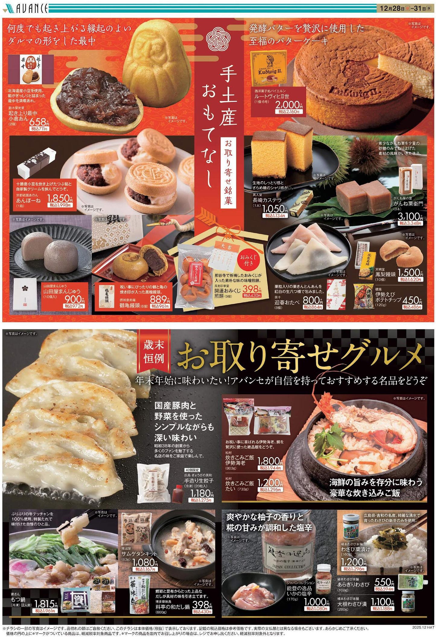 食品スーパーであるアバンセ2025年12/28号のチラシです。歳末の企画意図が紙面構成に反映されています。