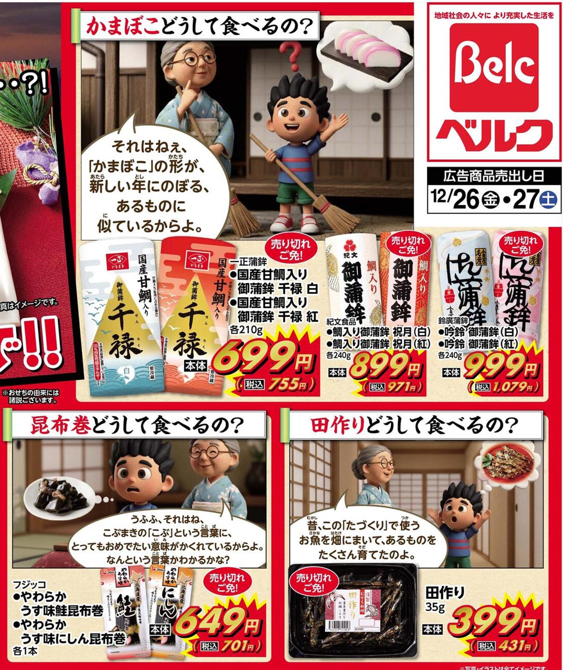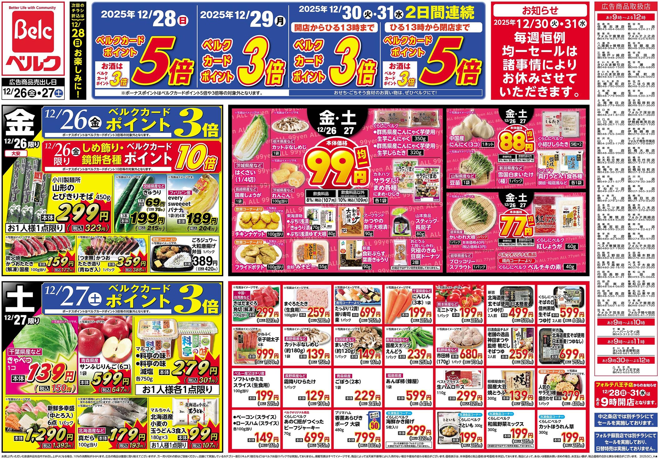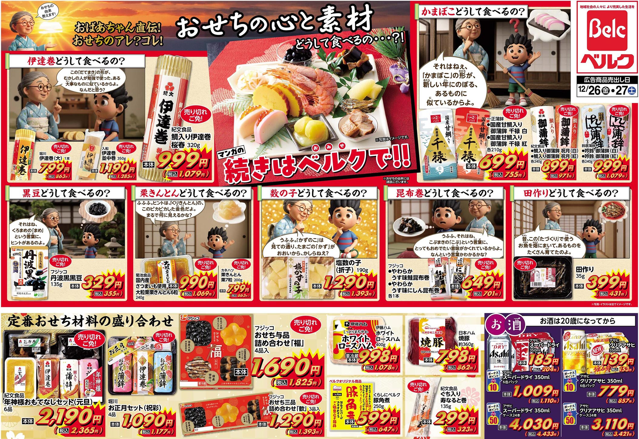 ベルク2025年12/26号(食品スーパー)のチラシです。ストーリー・歳末をテーマに、シンプルなビジュアルとデザインフォント・イラスト使用のデザインが特徴です。
