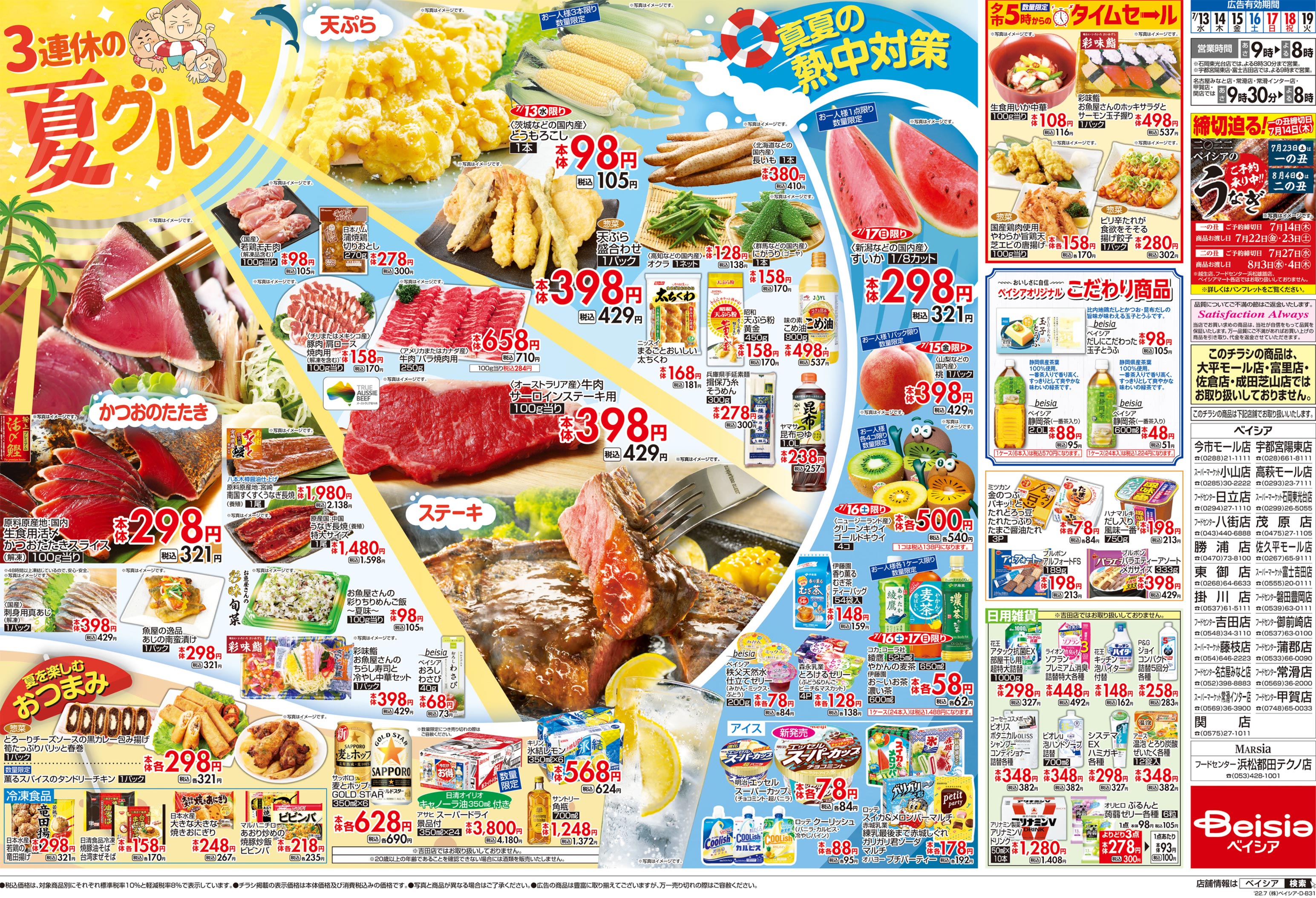 食品スーパーであるベイシア2022年7/16号のチラシです。夏の企画意図が紙面構成に反映されています。