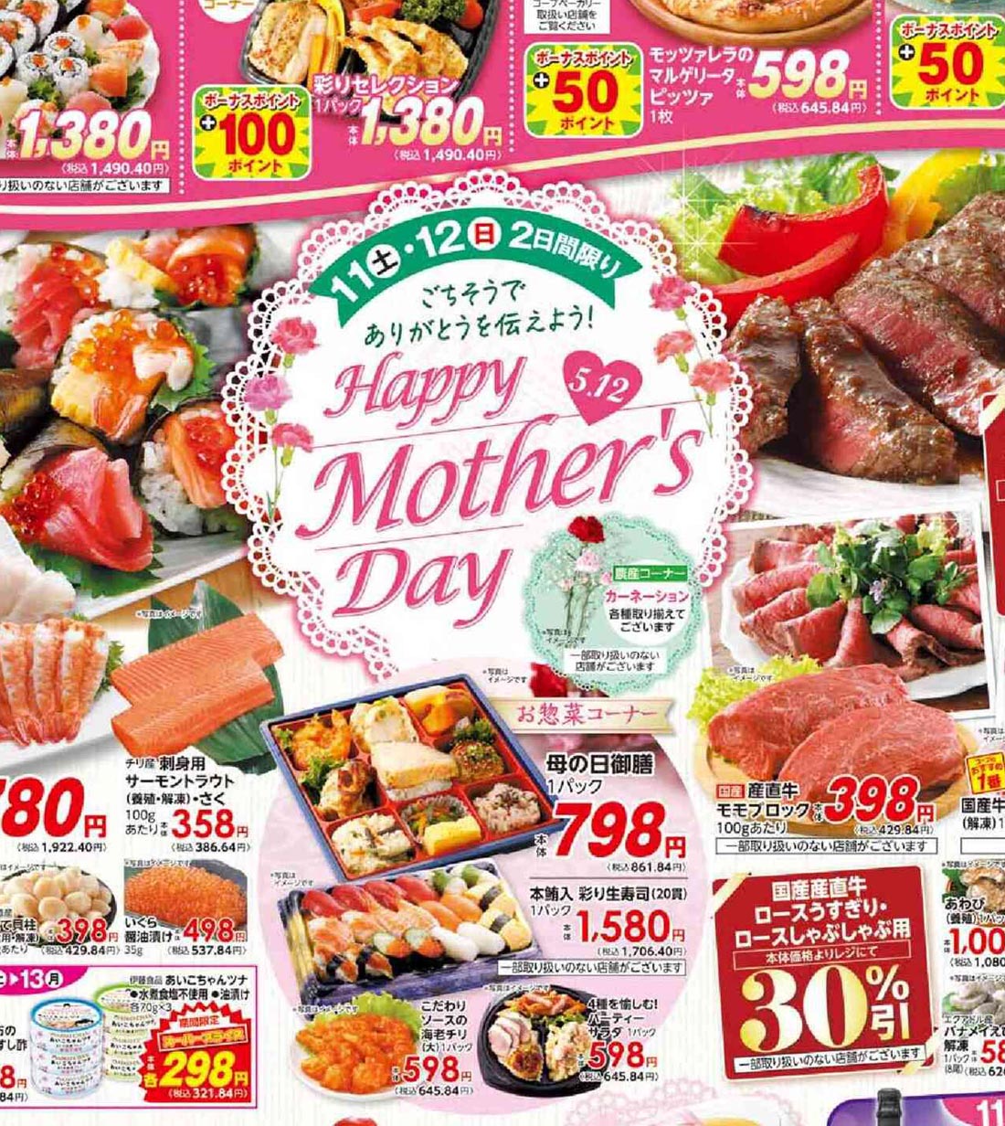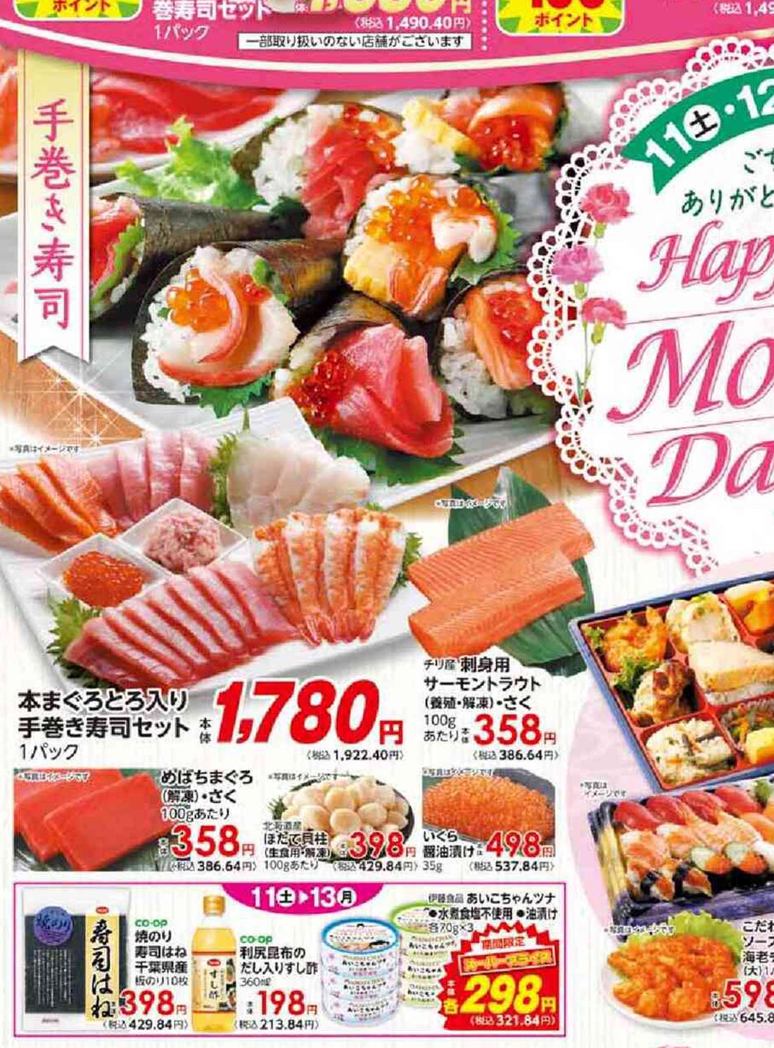 コープ2024年5/11号(食品スーパー)のチラシ内容を紹介します。母の日を中心に、スタイリッシュな要素とデザインフォント・イラスト使用の表現で構成されたデザインです。