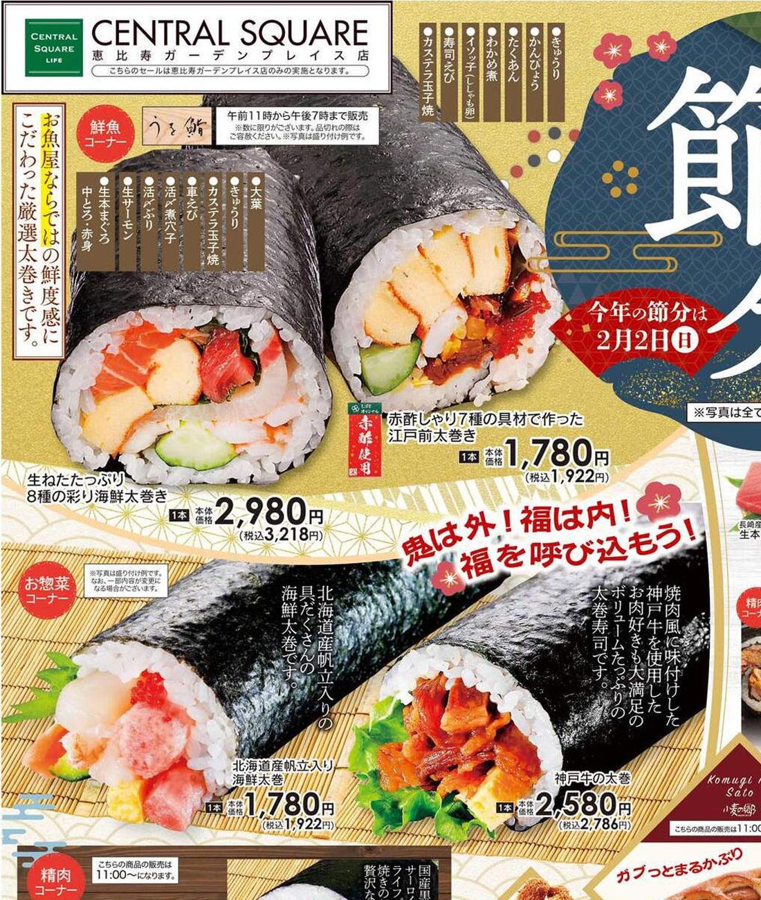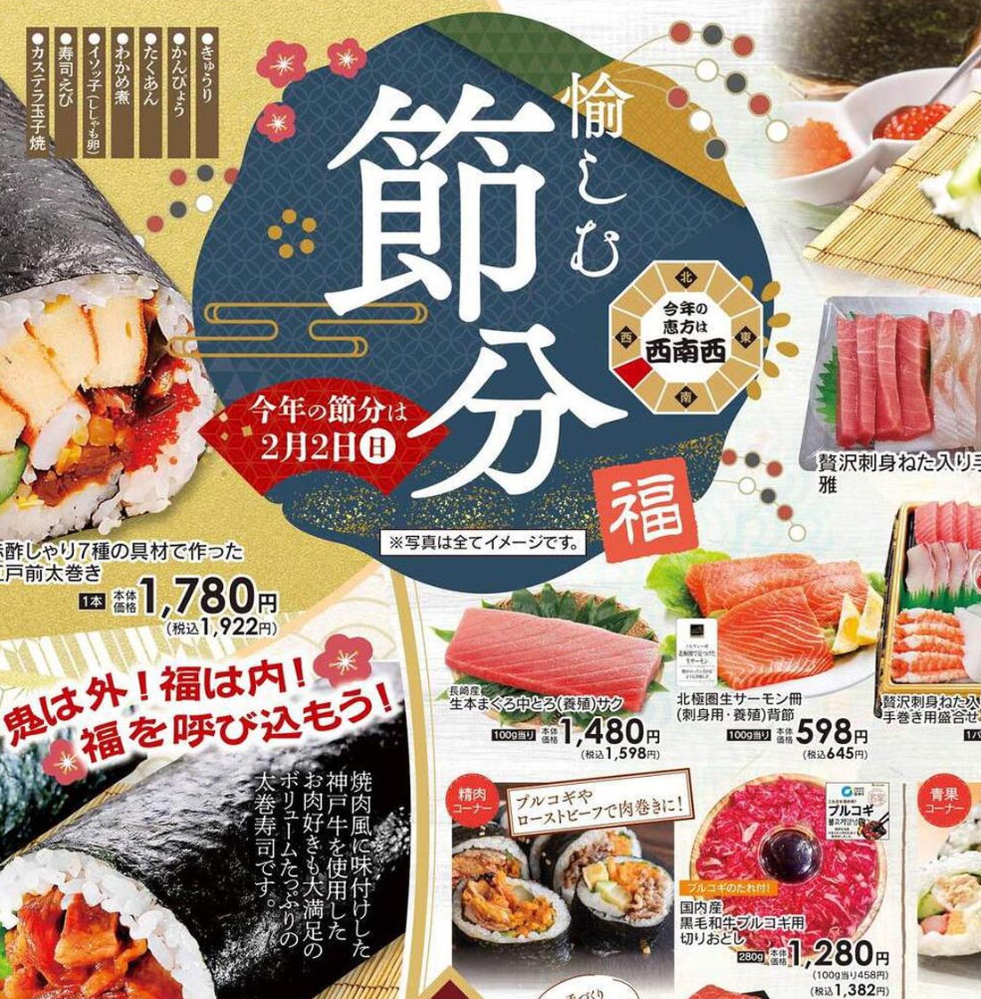 CSライフ2025年2/2号(食品スーパー)のチラシ内容を紹介します。恵方巻を中心に、スタイリッシュ・和風な要素と明朝系・イラスト使用の表現で構成されたデザインです。