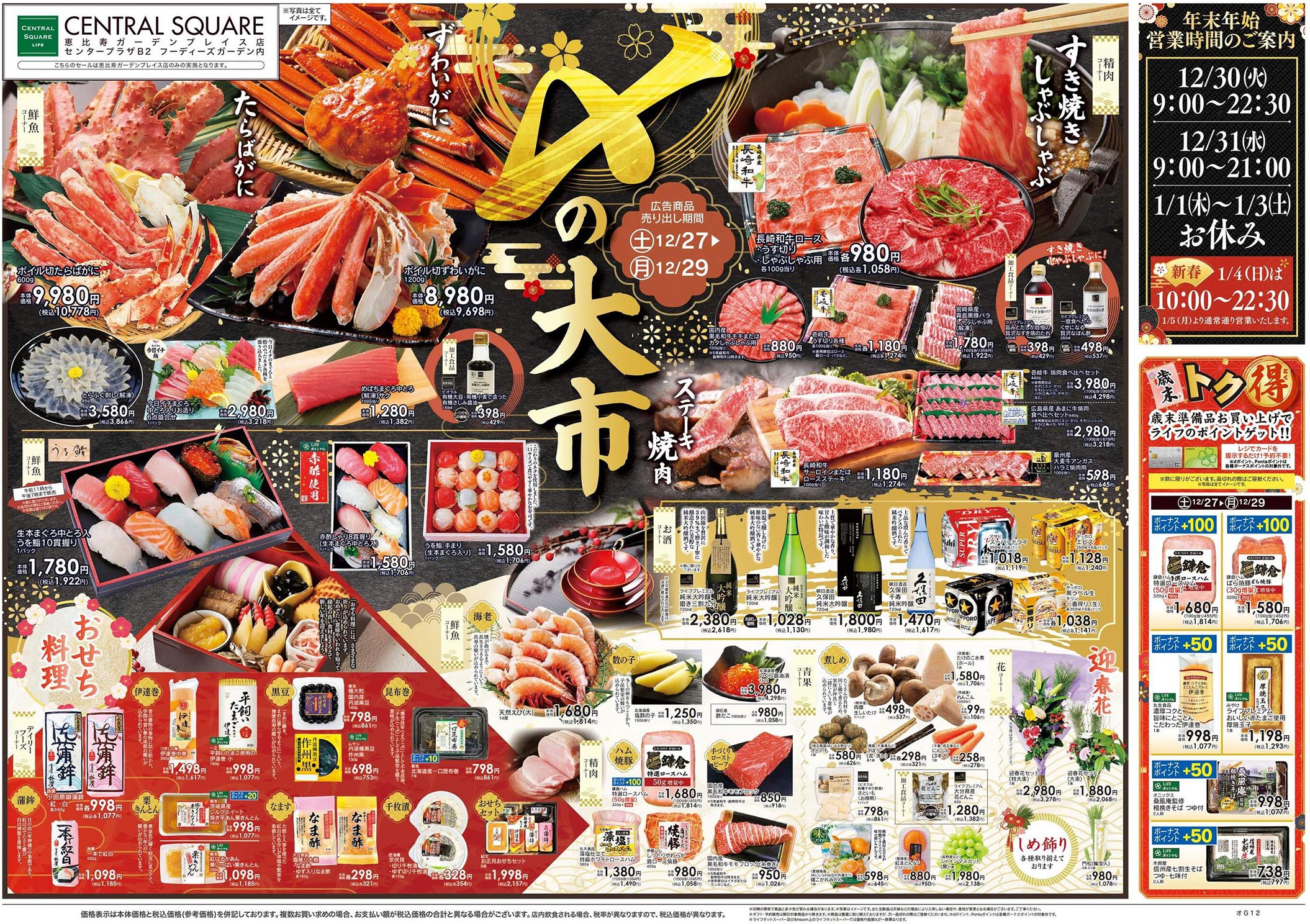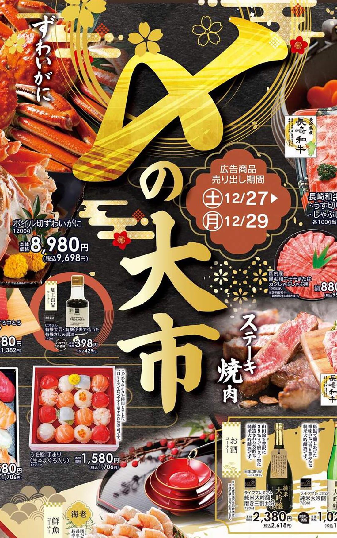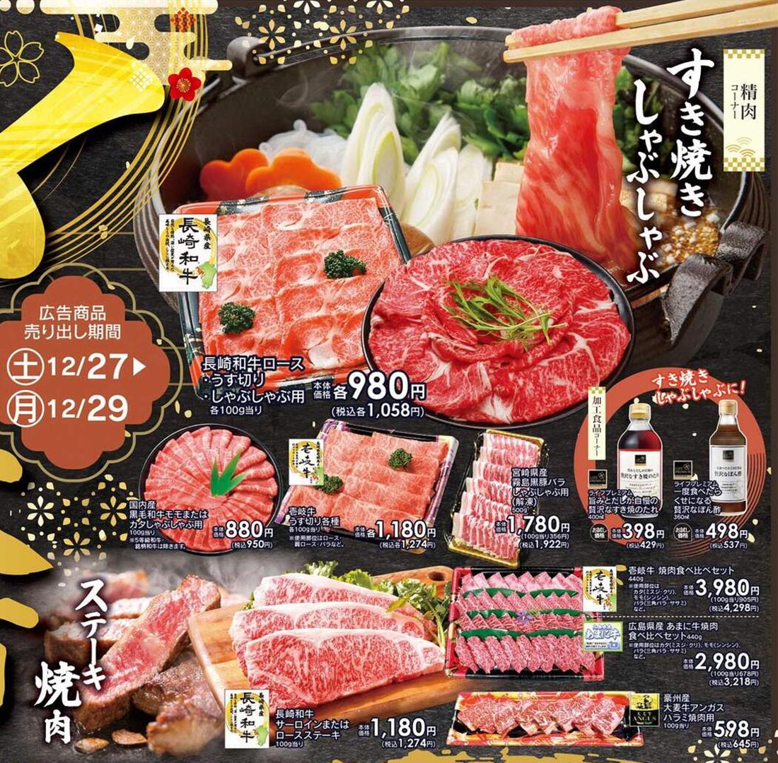 CSライフ2025年12/27号(食品スーパー)のチラシでは、歳末をテーマにした構成が採用されています。スタイリッシュ・勢い・高級感な印象と手書き・筆・イラスト使用のデザイン表現が特徴的です。