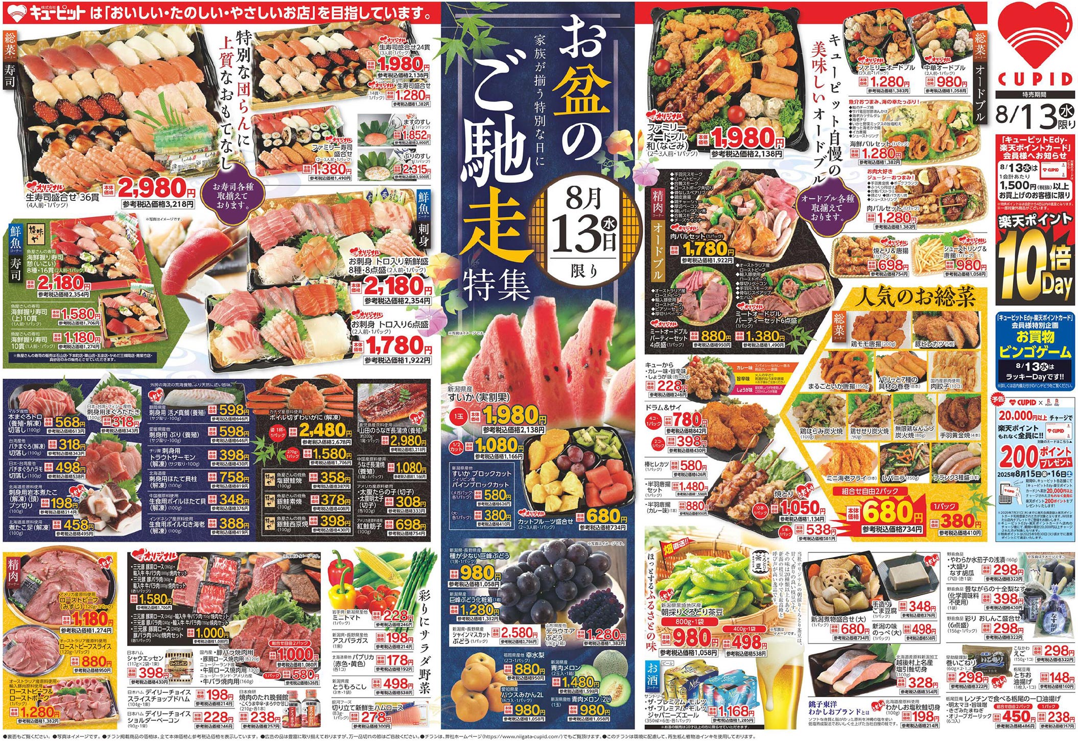 キューピット2025年8/13号(食品スーパー)のチラシでは、お盆をテーマにした構成が採用されています。シンプル・和風・高級感な印象と明朝系・イラスト使用のデザイン表現が特徴的です。