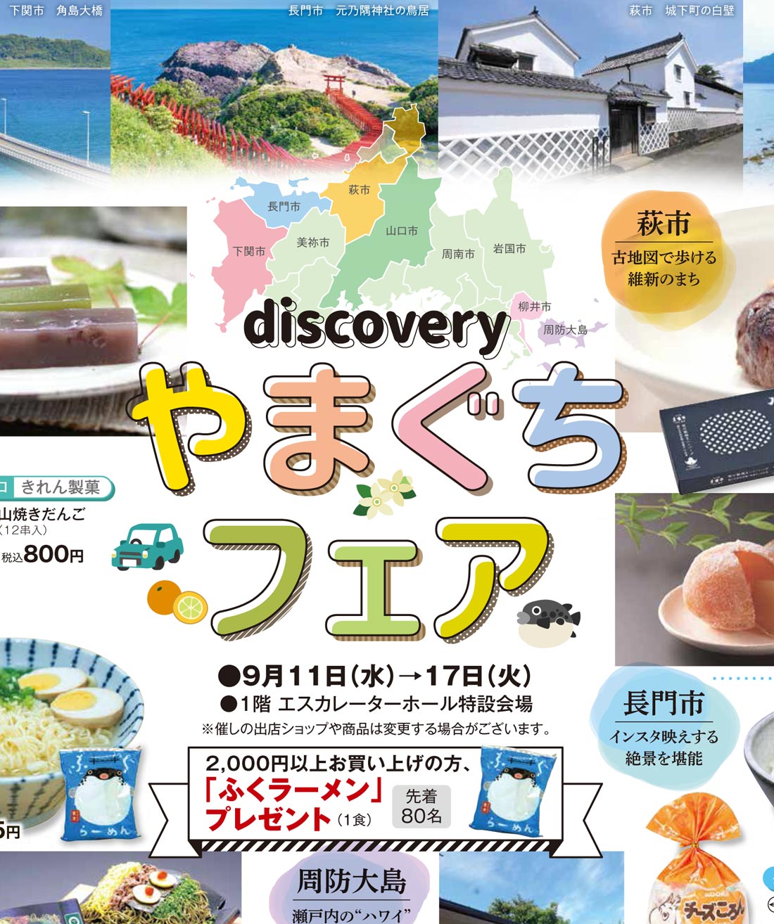 大丸須磨店2024年9/11号(百貨店)のチラシでは、山口をテーマにした構成が採用されています。パステル・ポップな印象とゴシック系・イラスト使用のデザイン表現が特徴的です。