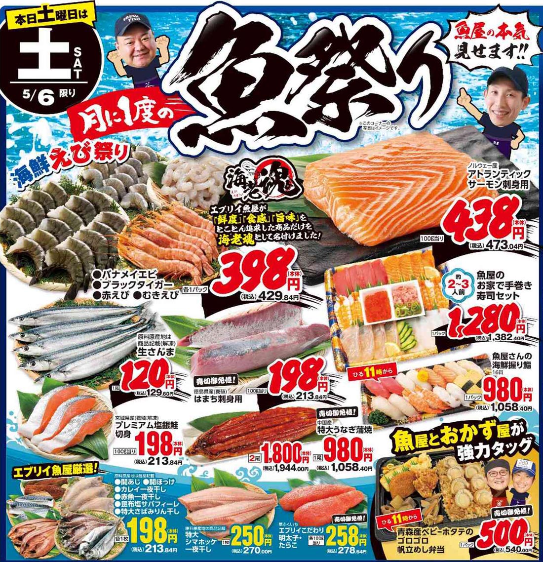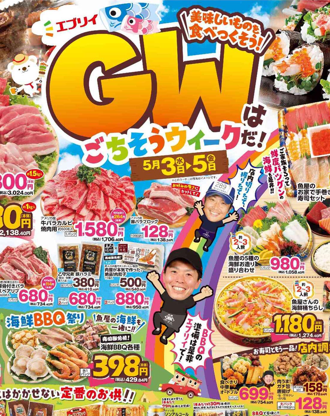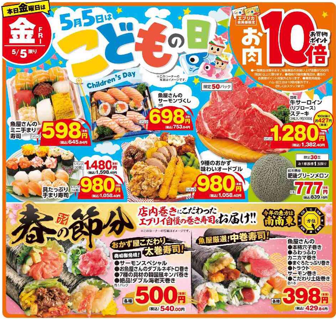 エブリイ2023年5/3号(食品スーパー)のチラシ内容を紹介します。キャラクター・GWを中心に、ポップな要素とデザインフォント・イラスト使用・人物の表現で構成されたデザインです。