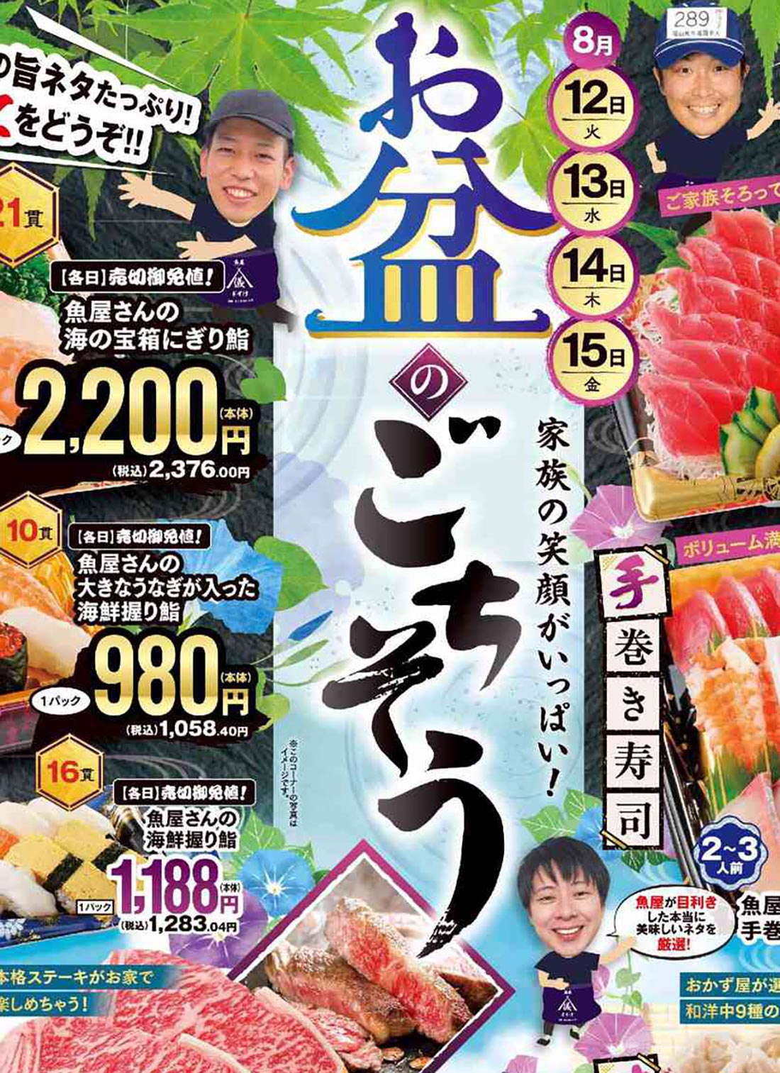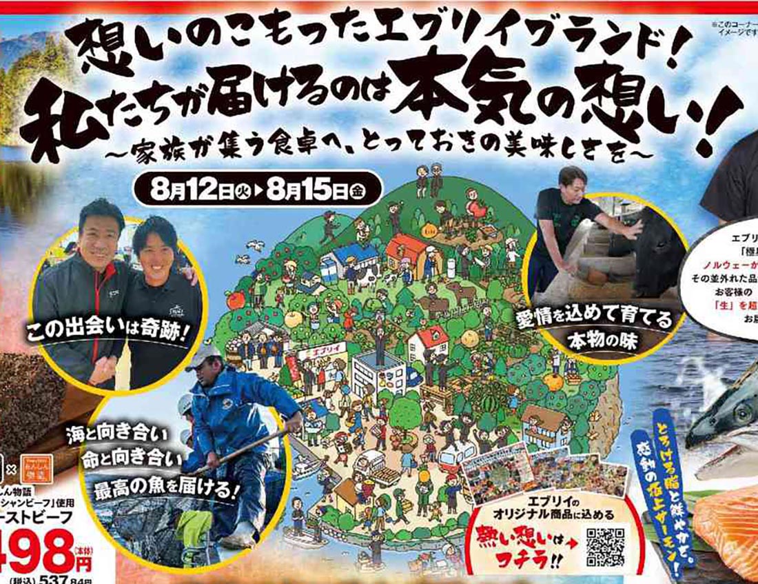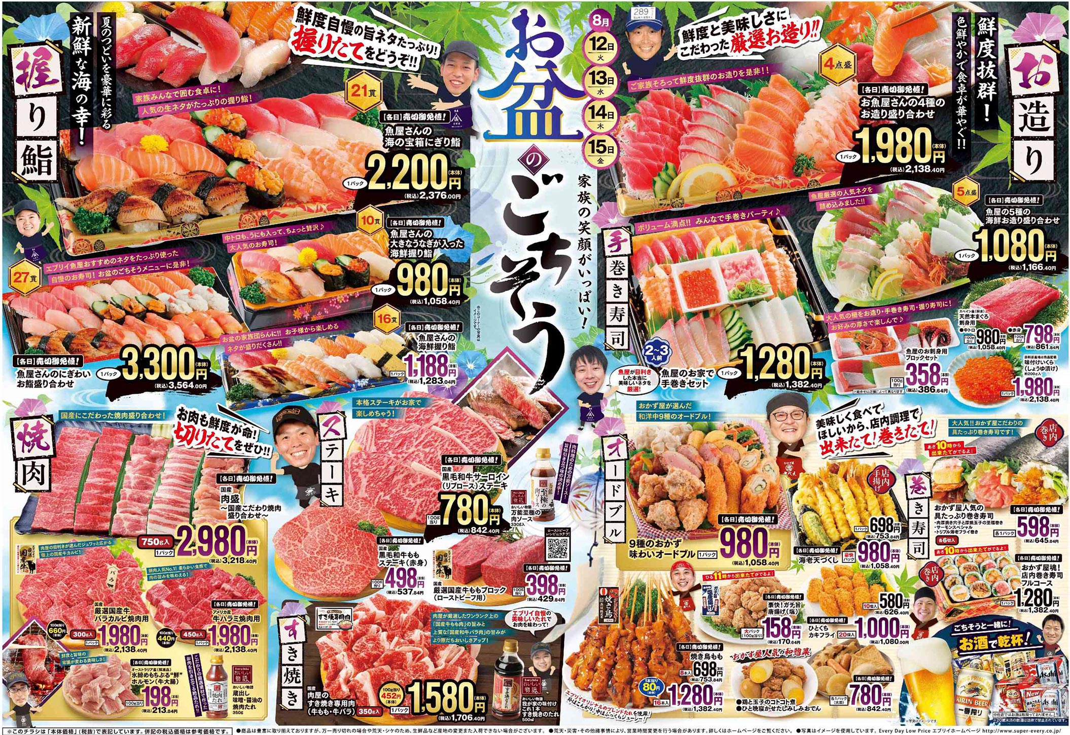 エブリイ2025年8/12号(食品スーパー)のチラシです。お盆をテーマに、スタイリッシュ・和風なビジュアルと手書き・筆・明朝系・イラスト使用・人物のデザインが特徴です。