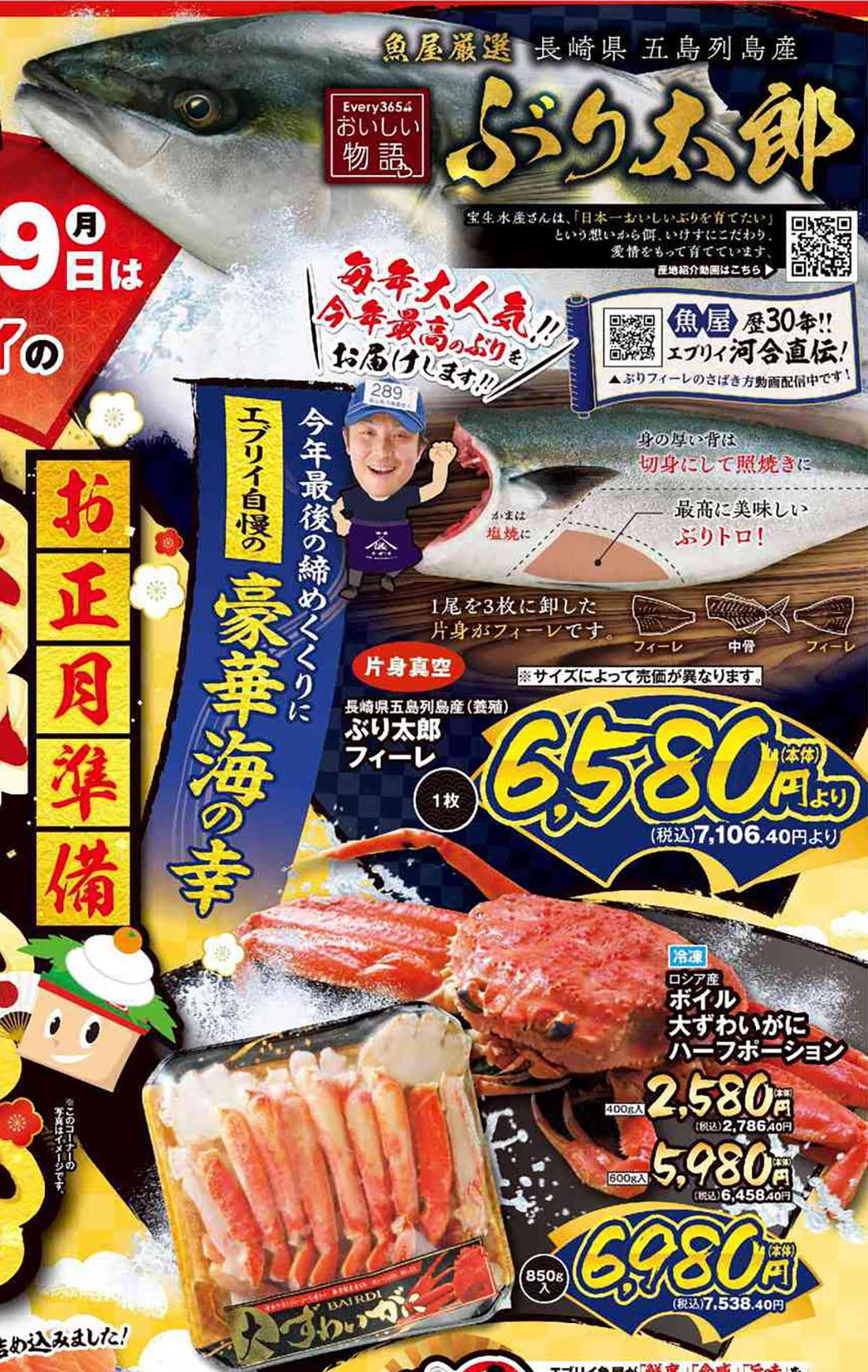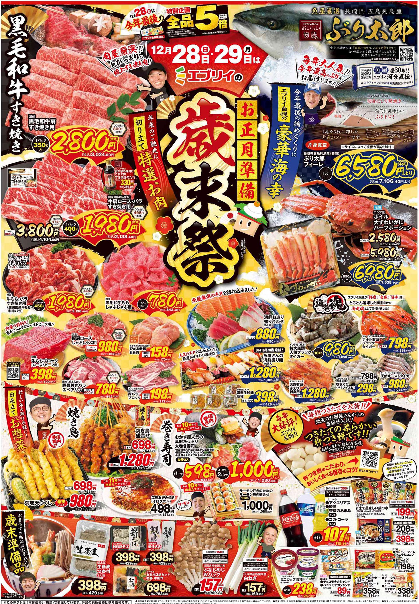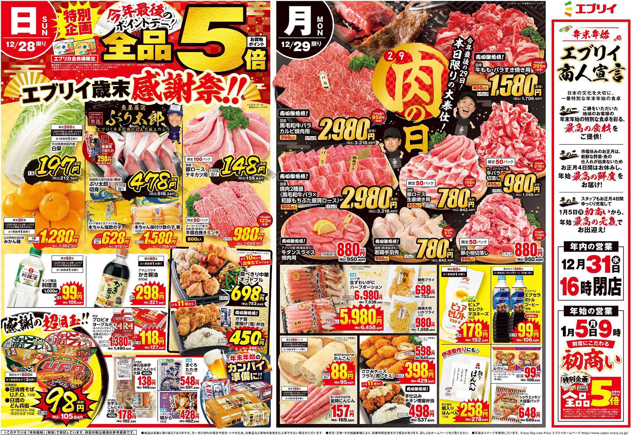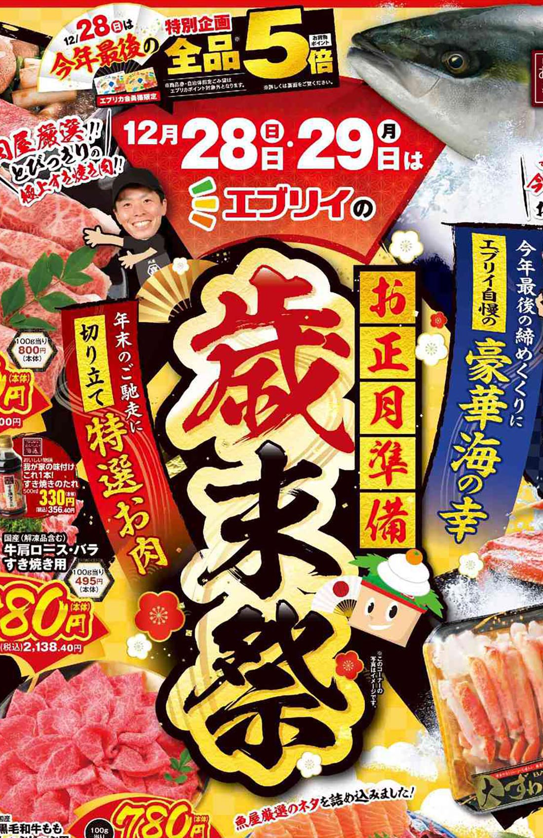 食品スーパーであるエブリイ2025年12/28号のチラシです。歳末の企画意図が紙面構成に反映されています。