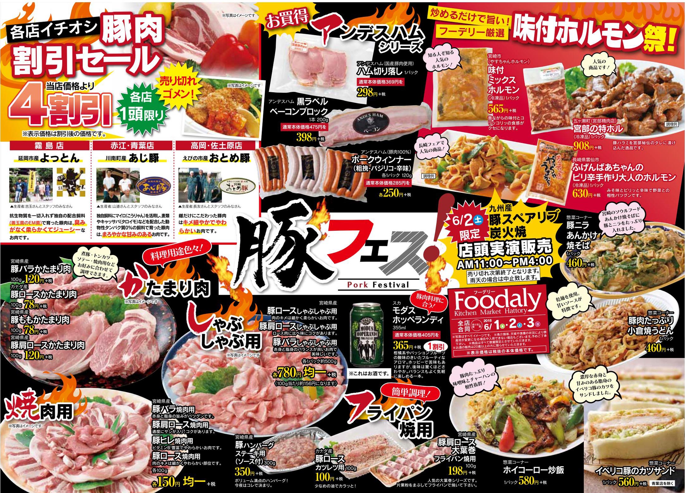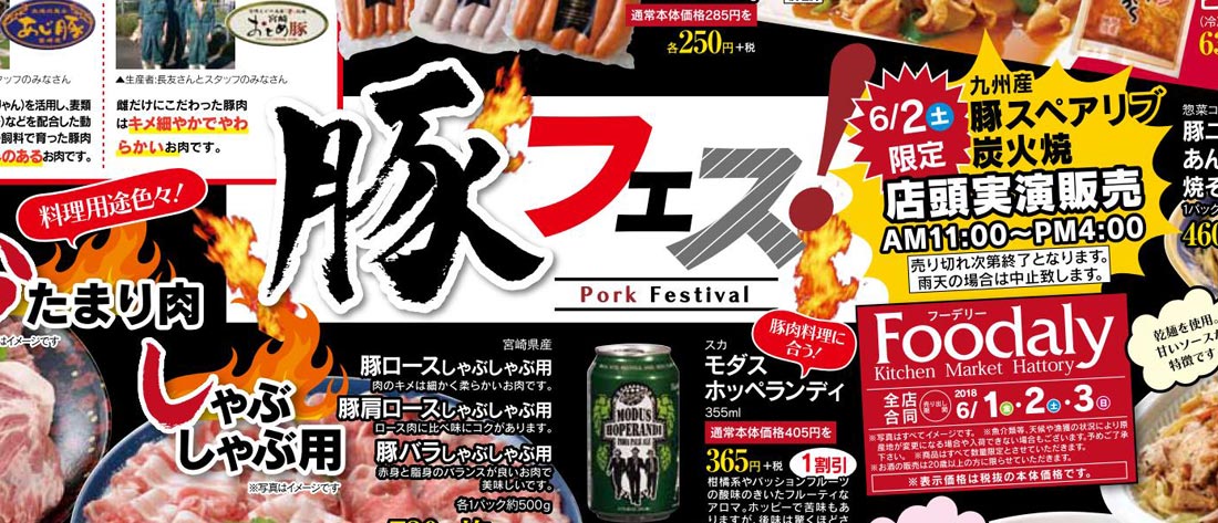 フーデリー2018年6/1号(食品スーパー)のチラシ内容を紹介します。BBQ・肉を中心に、スタイリッシュ・勢いな要素とゴシック系・手書き・筆・かすれ・イラスト使用の表現で構成されたデザインです。
