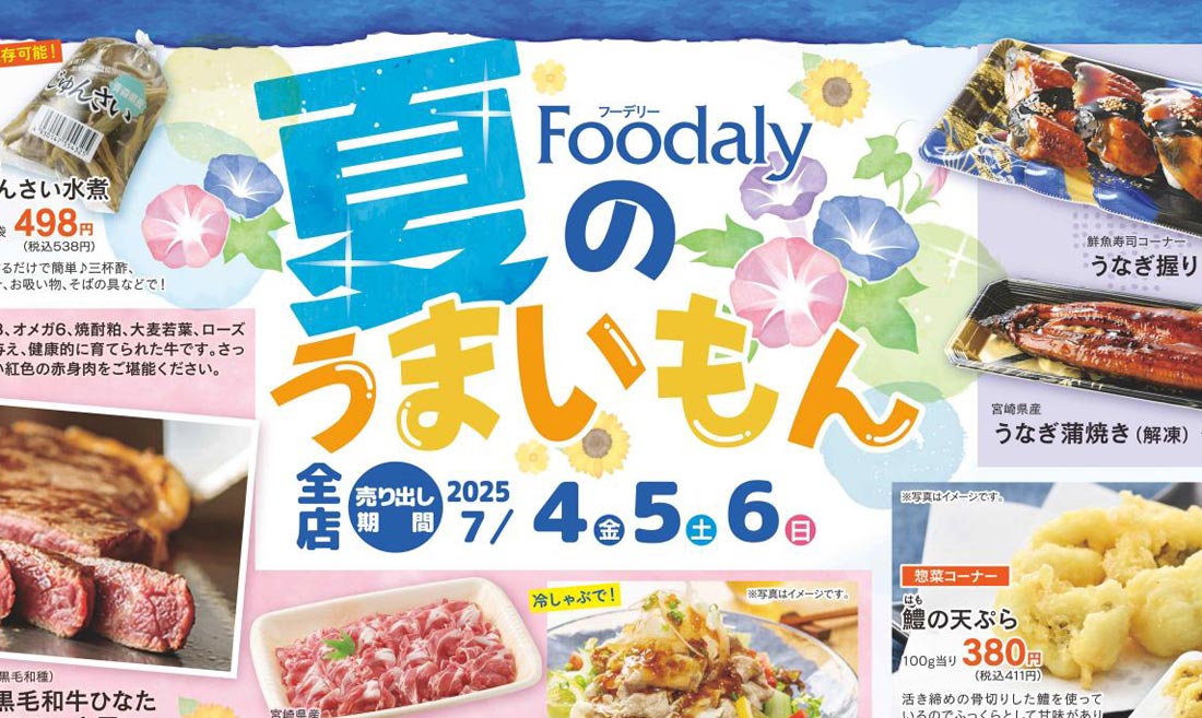 食品スーパーであるフーデリー2025年7/4号のチラシです。夏の企画意図が紙面構成に反映されています。