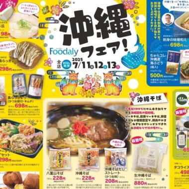 フーデリー2025年7/11号(食品スーパー)のチラシでは、I 沖縄をテーマにした構成が採用されています。ポップな印象とデザインフォント・イラスト使用のデザイン表現が特徴的です。
