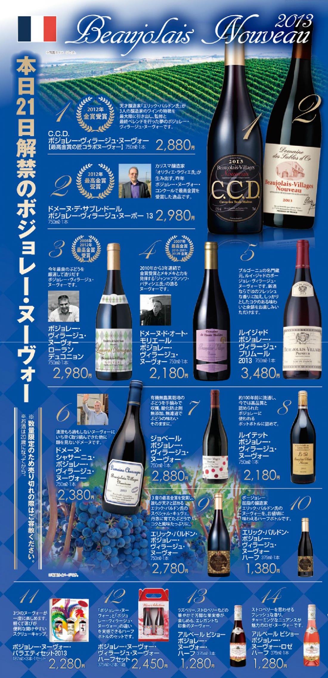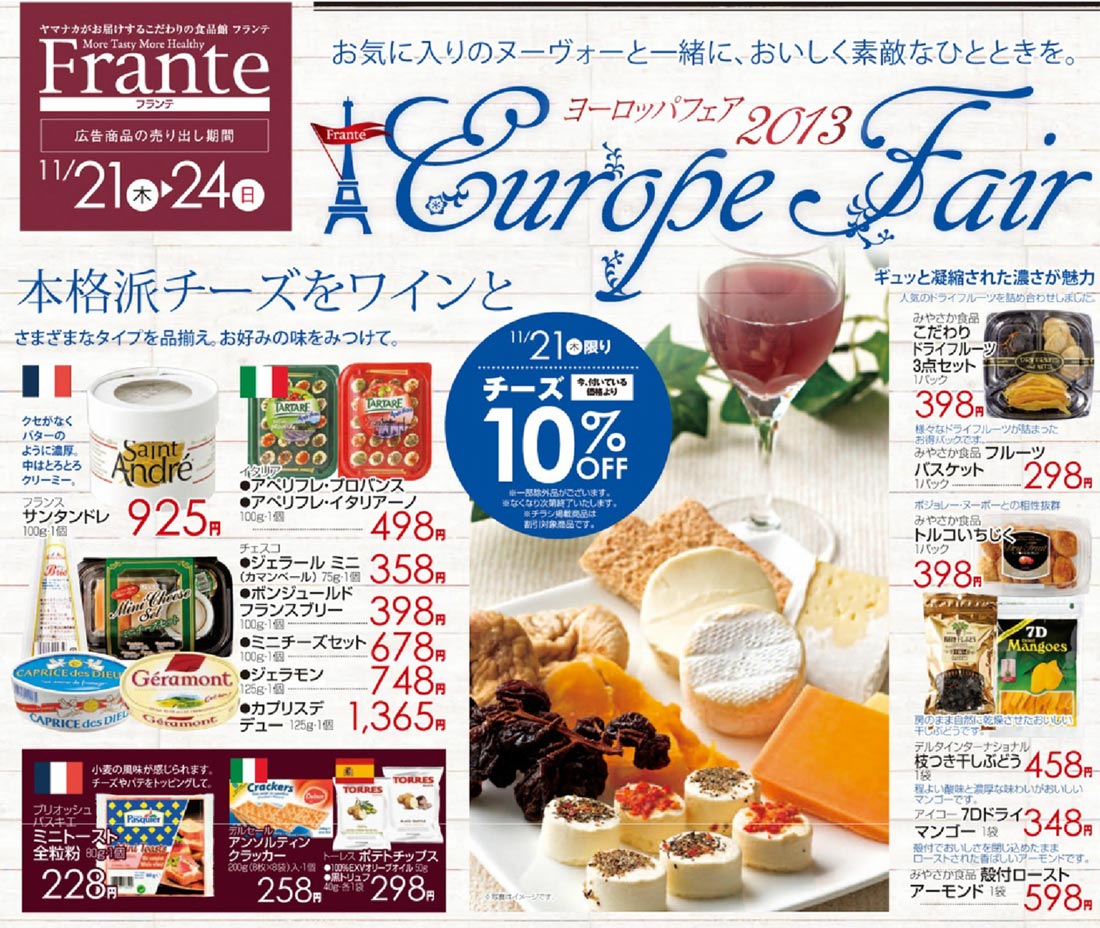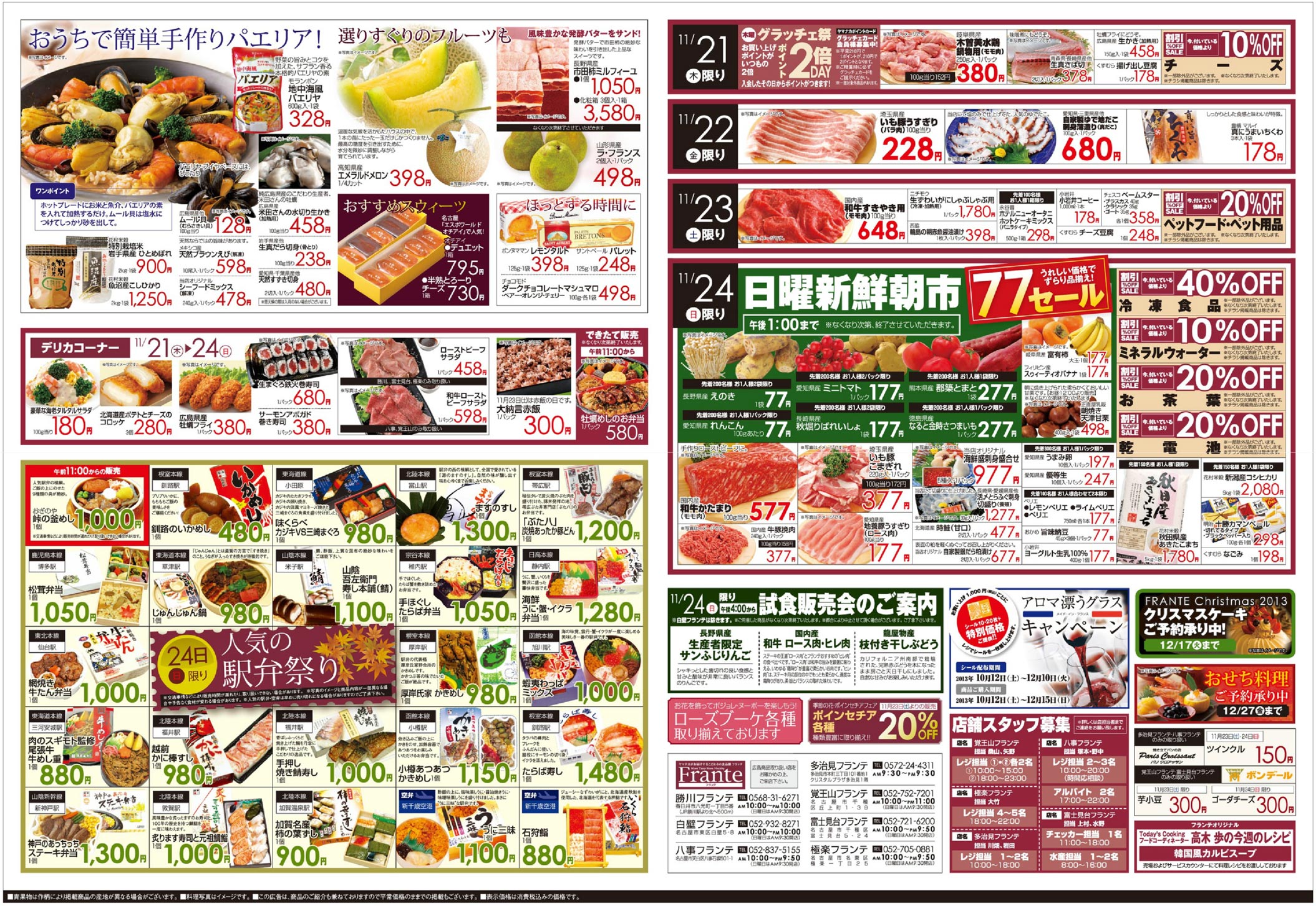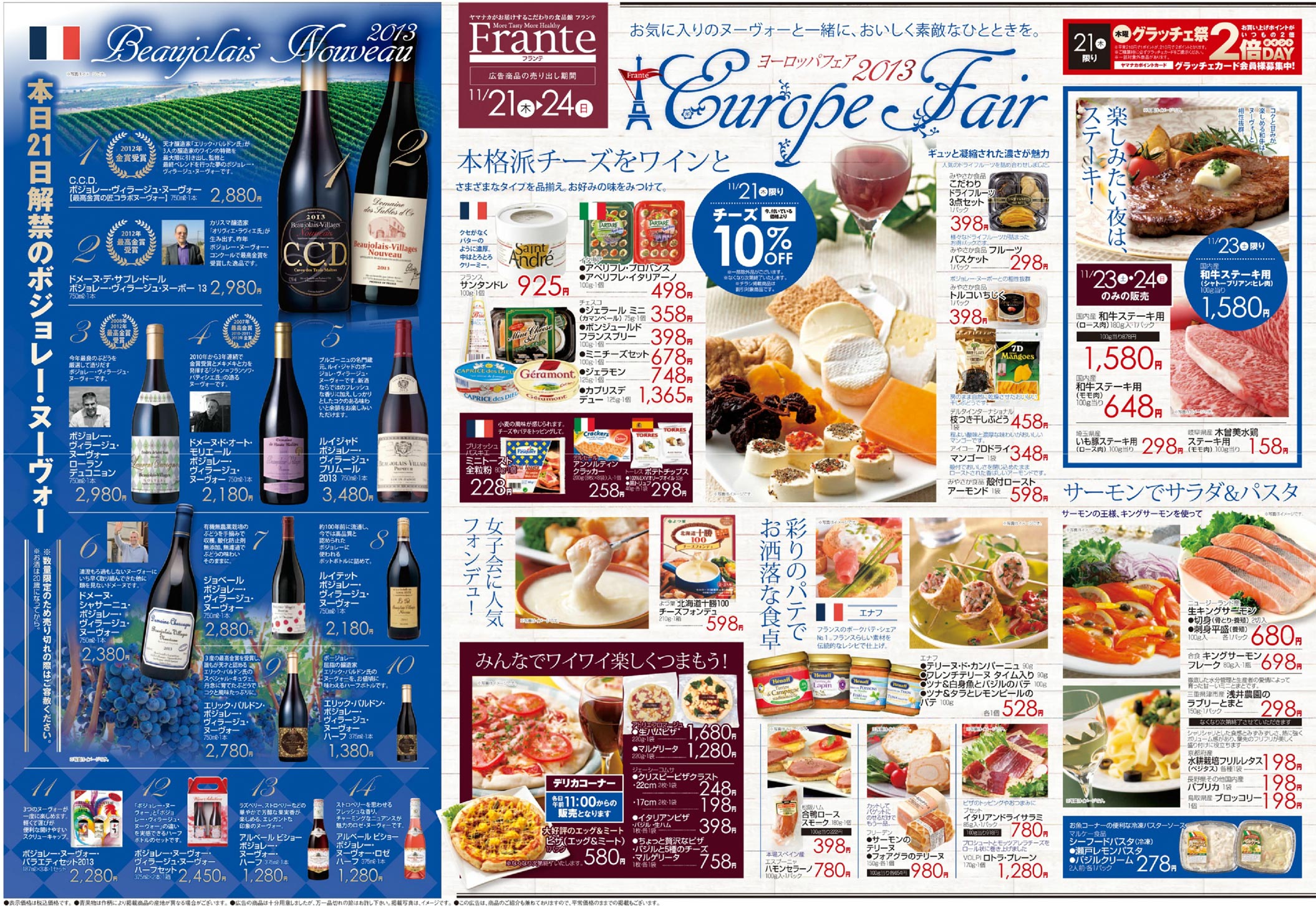フランテ2013年11/21号(食品スーパー)のチラシです。ボジョレーをテーマに、スタイリッシュなビジュアルとデザインフォント・イラスト使用のデザインが特徴です。