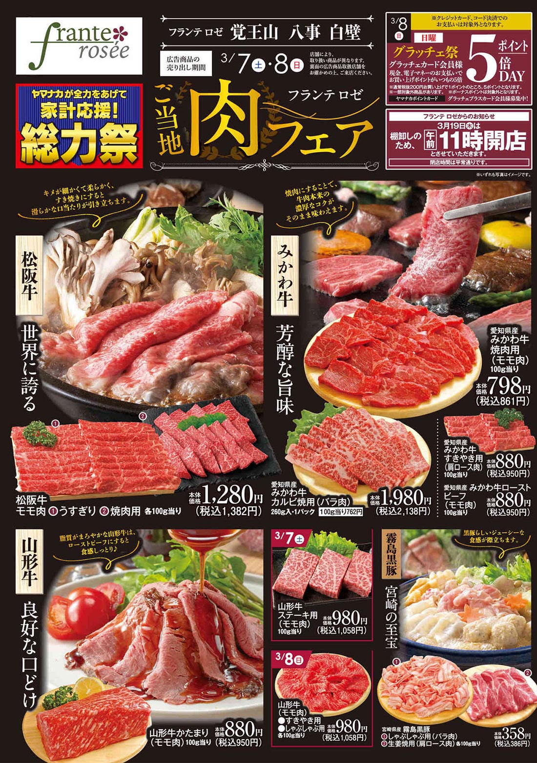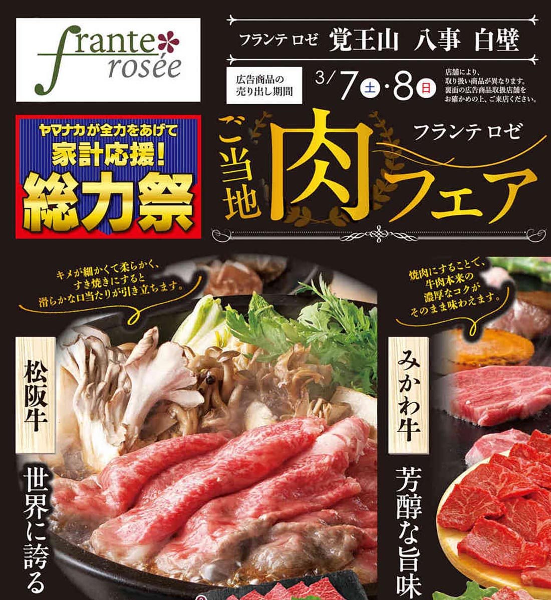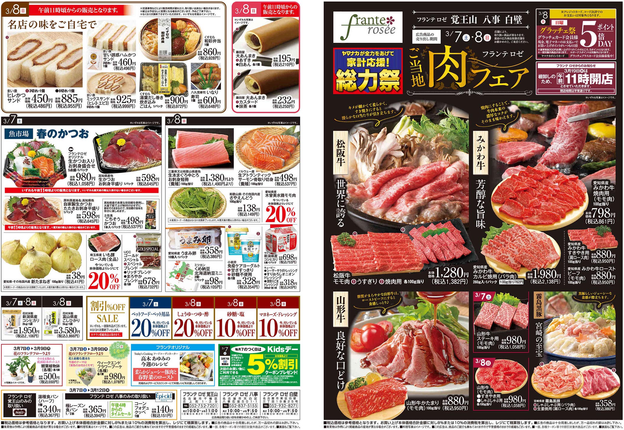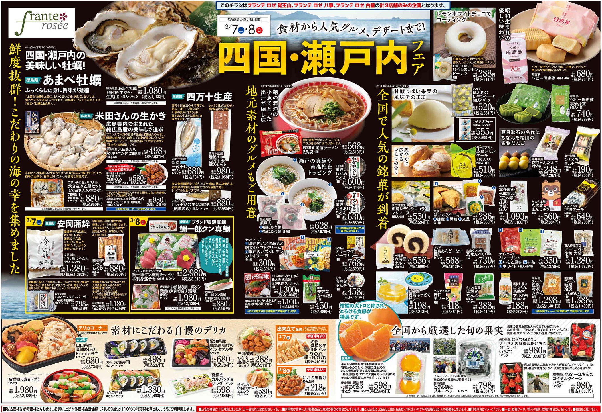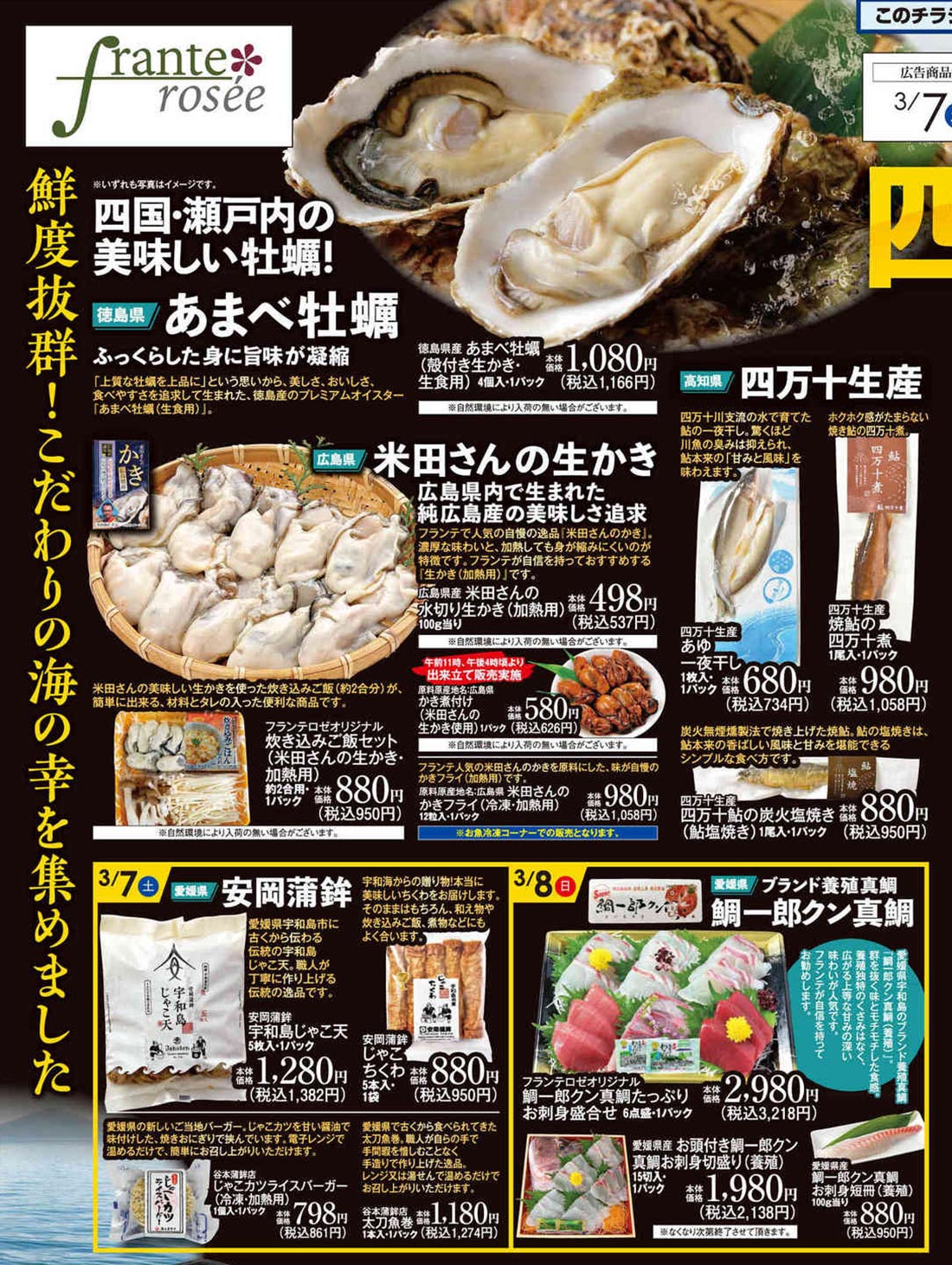 フランテ2026年3/7号(食品スーパー)のチラシ内容を紹介します。瀬戸内・G 四国地方を中心に、シンプルな要素とゴシック系・写真使用の表現で構成されたデザインです。