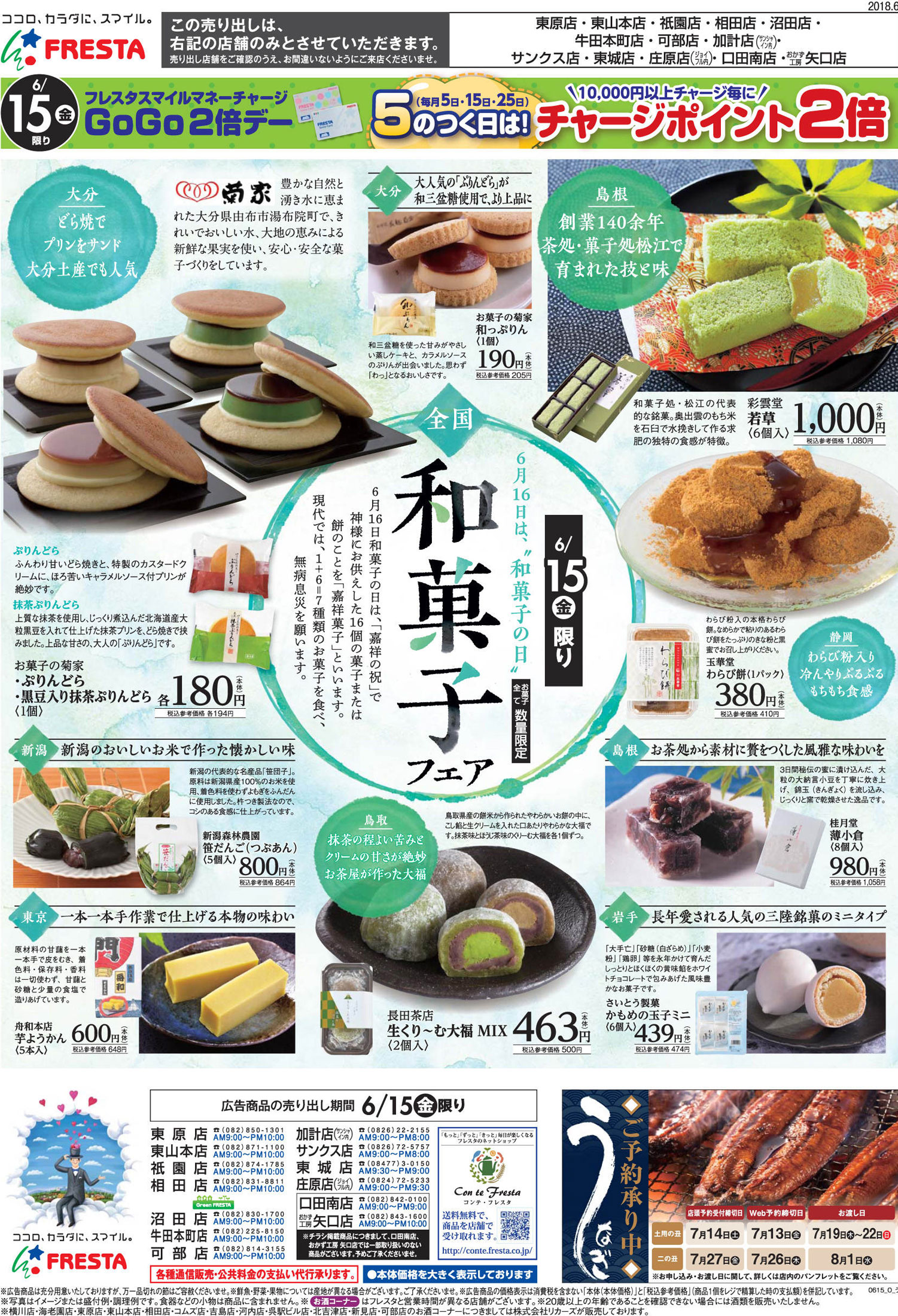 フレスタ2018年6/15号(食品スーパー)のチラシです。スイーツをテーマに、スタイリッシュ・和風なビジュアルとデザインフォント・手書き・筆・かすれのデザインが特徴です。