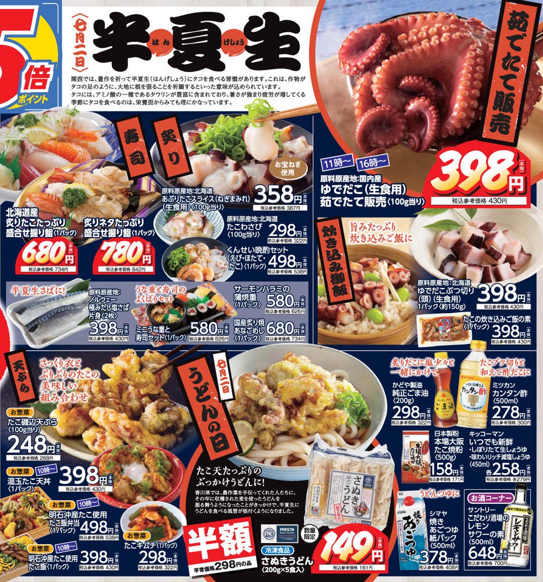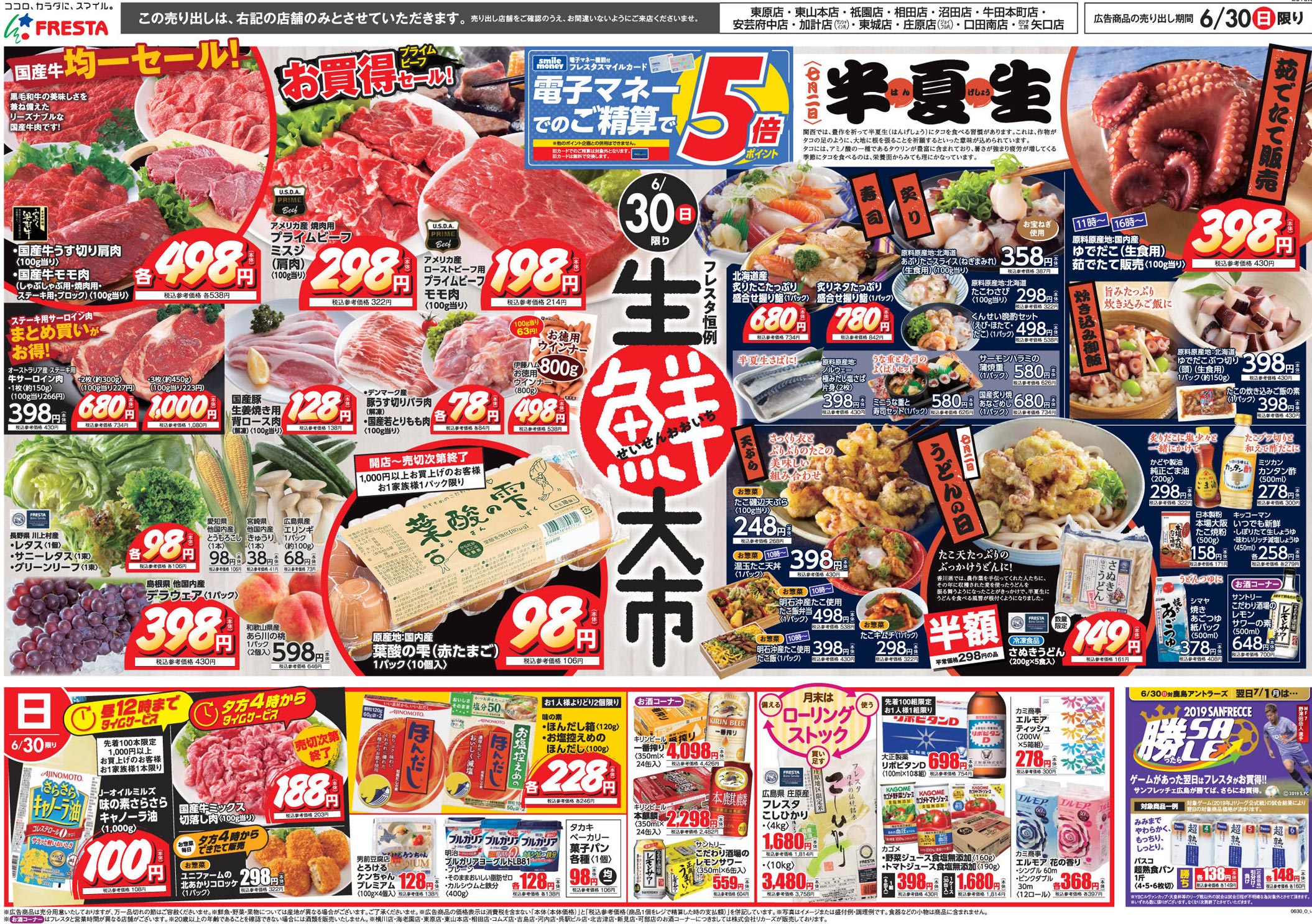 フレスタ2019年6/30号(食品スーパー)のチラシ内容を紹介します。半夏生を中心に、シンプル・和風な要素と手書き・筆の表現で構成されたデザインです。