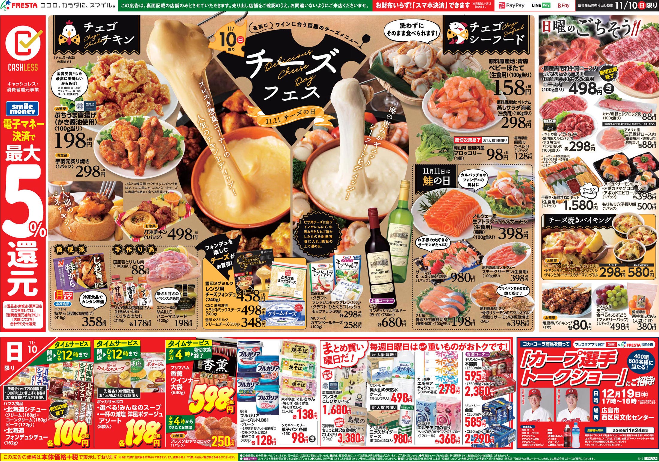 フレスタ2019年11/10号(食品スーパー)のチラシ内容を紹介します。チーズを中心に、スタイリッシュな要素とデザインフォント・写真使用の表現で構成されたデザインです。