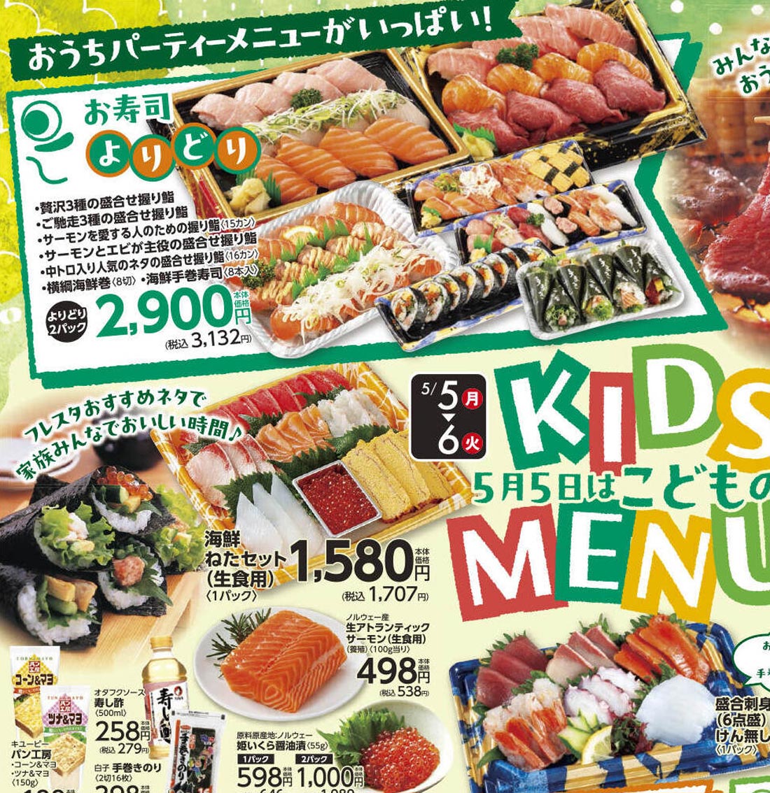 食品スーパーであるフレスタ2025年5/5号のチラシです。GWの企画意図が紙面構成に反映されています。