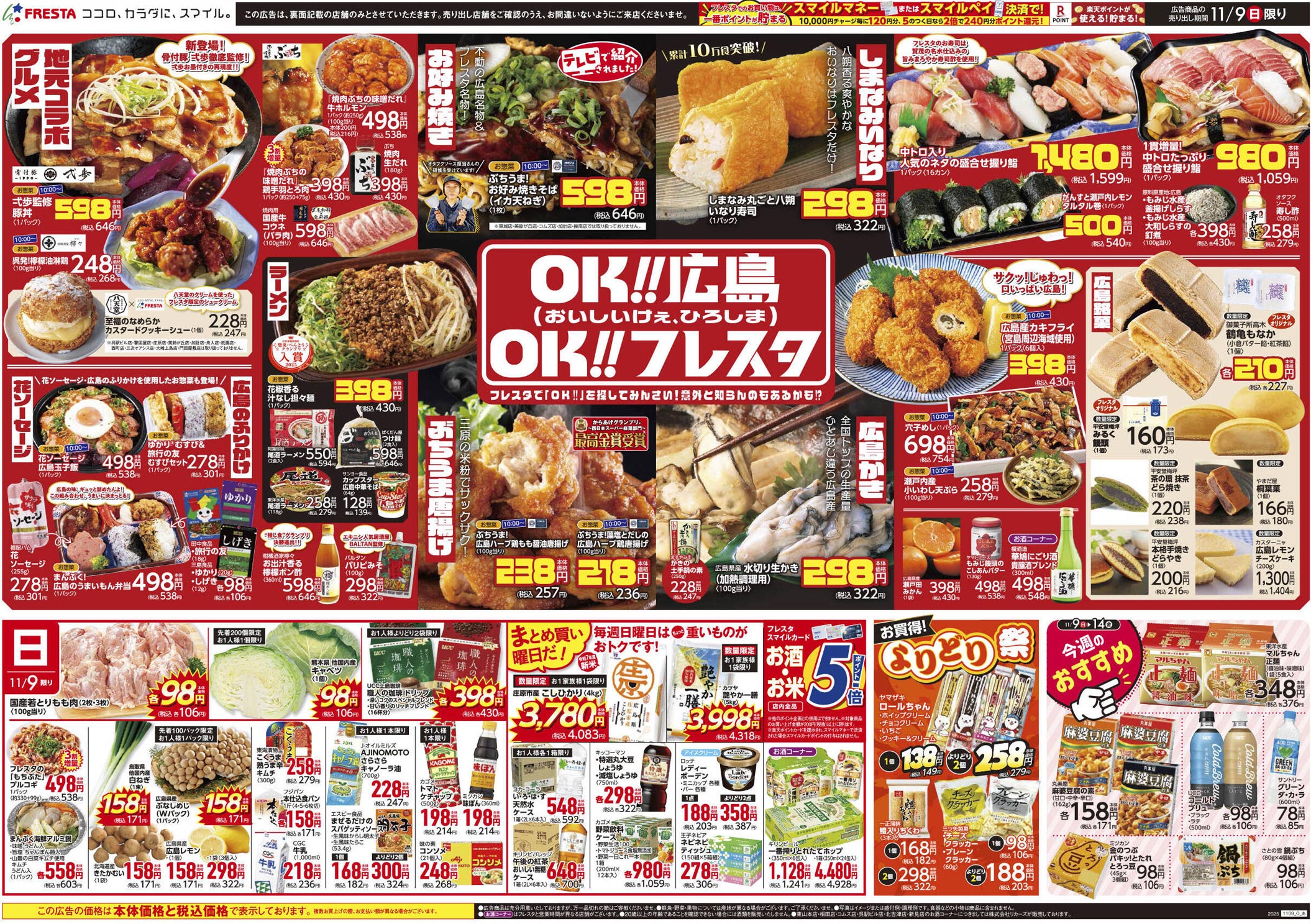 フレスタ2025年11/9号(食品スーパー)のチラシです。広島をテーマに、シンプル・レトロなビジュアルとデザインフォントのデザインが特徴です。
