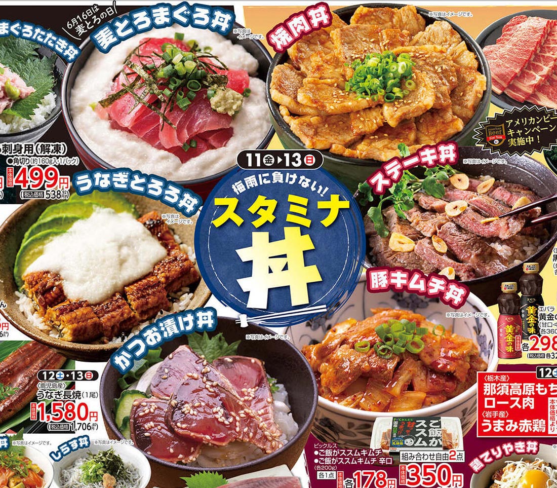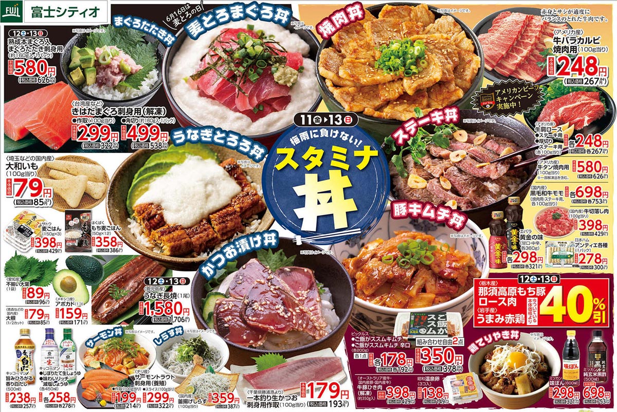 フジ2021年6/11号(食品スーパー)のチラシでは、丼を軸に商品提案がまとめられています。食品スーパーならではの視点で構成された紙面デザインが印象的です。