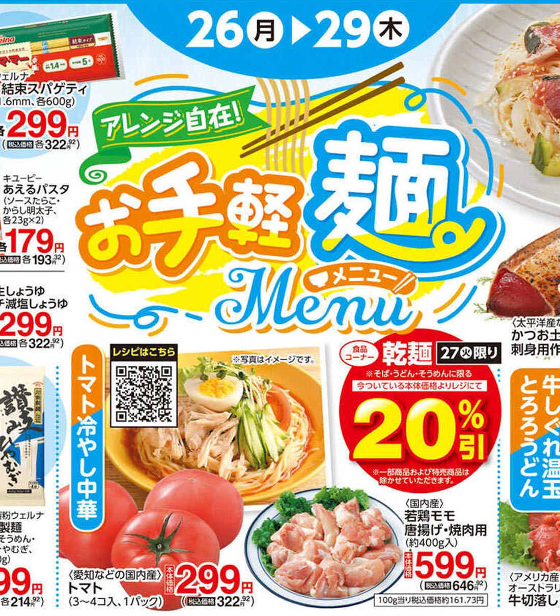 | キャッチコピー | ●夏野菜のスパゲッティ ●豆乳ガパオ風そうめん ●トマト冷やし中華 ●牛しぐれ温玉そうめん |