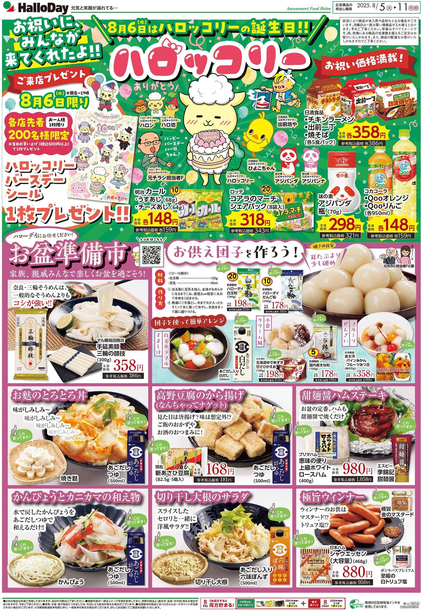 食品スーパーであるハローデイ2025年8/5号のチラシです。キャラクターの企画意図が紙面構成に反映されています。