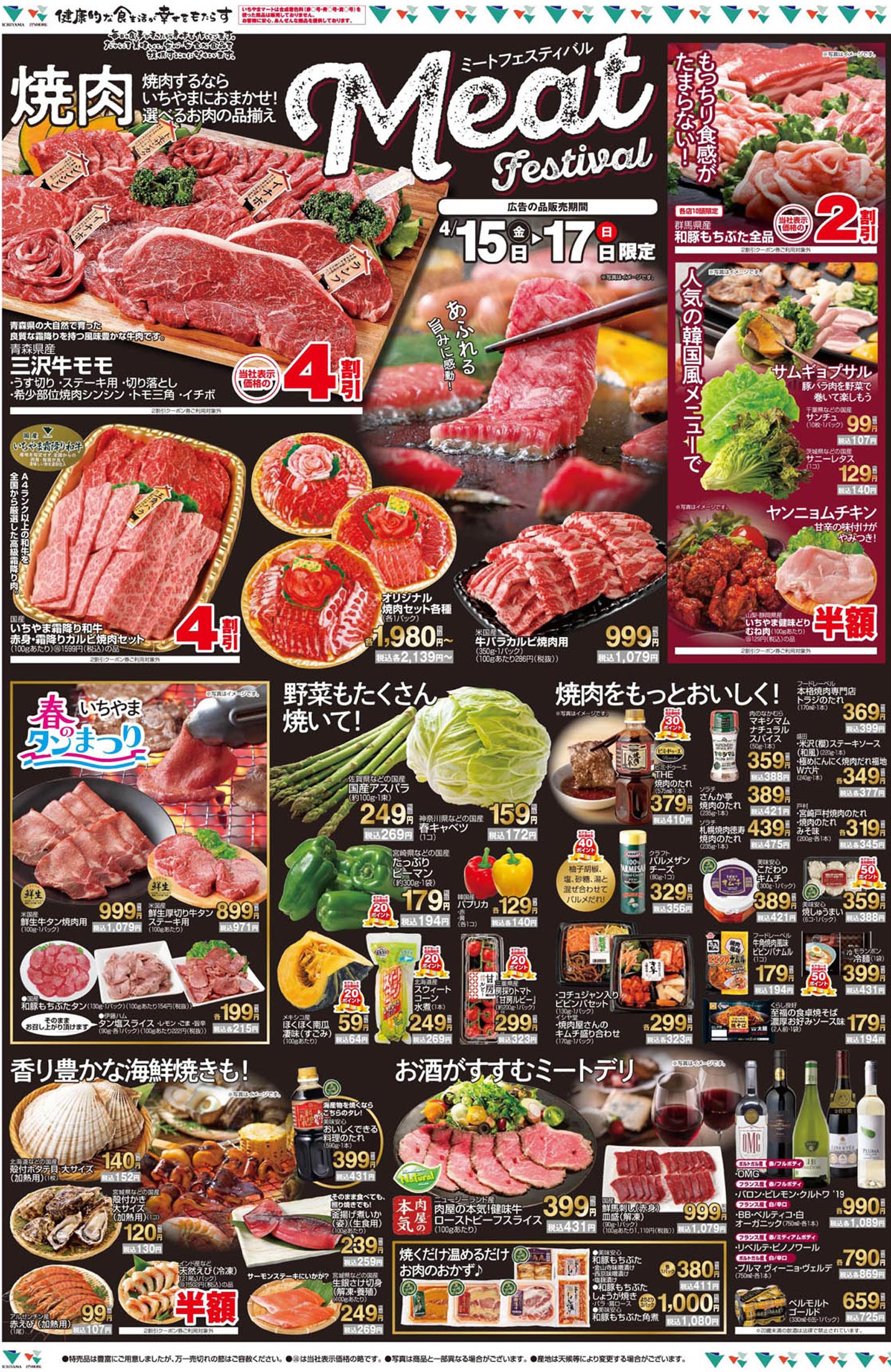 いちやまマート2022年4/15号(食品スーパー)のチラシでは、BBQ・肉をテーマにした構成が採用されています。スタイリッシュな印象とデザインフォント・写真使用のデザイン表現が特徴的です。