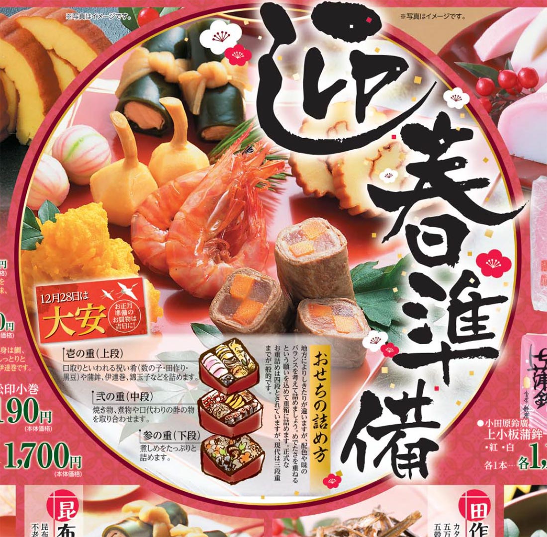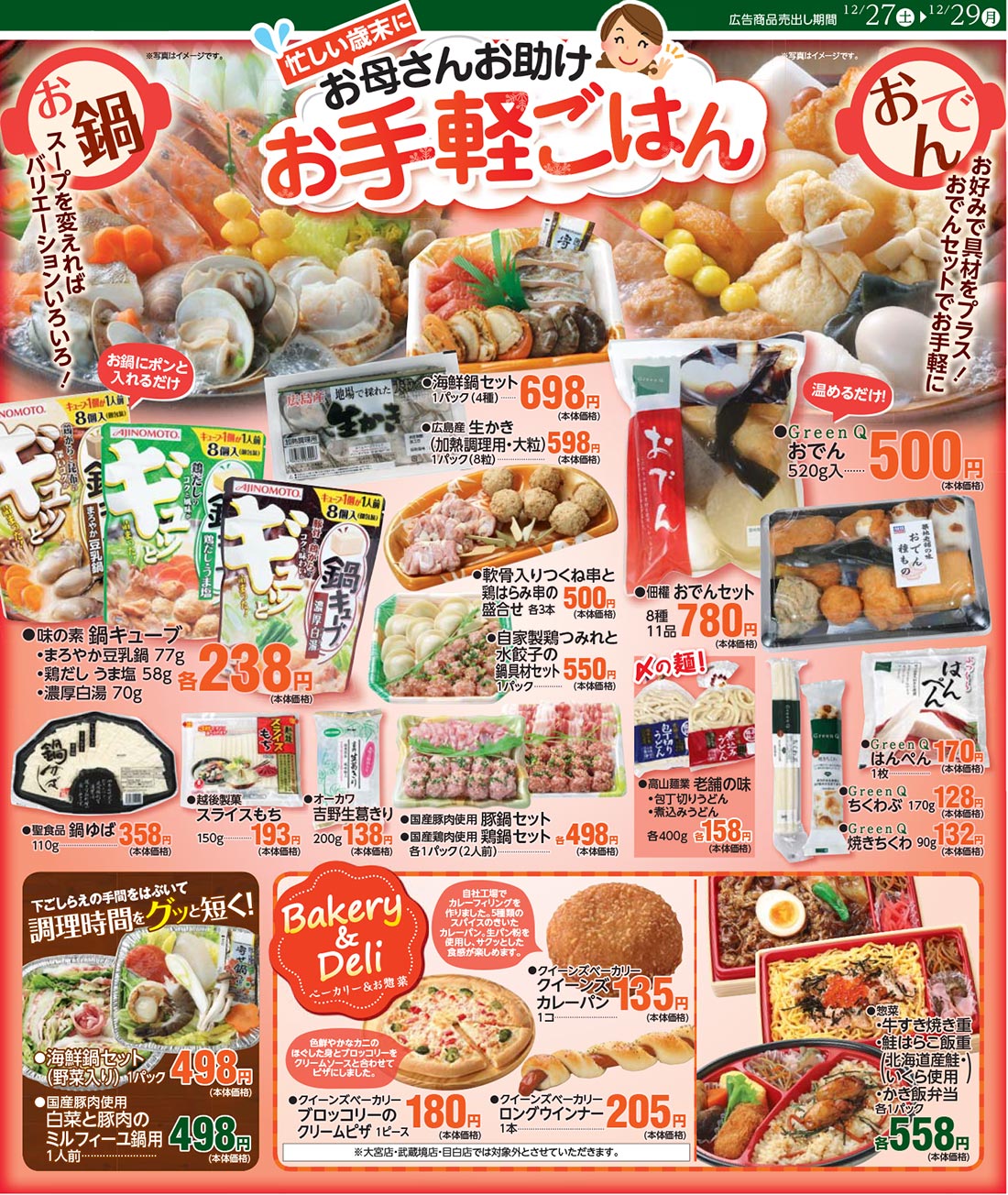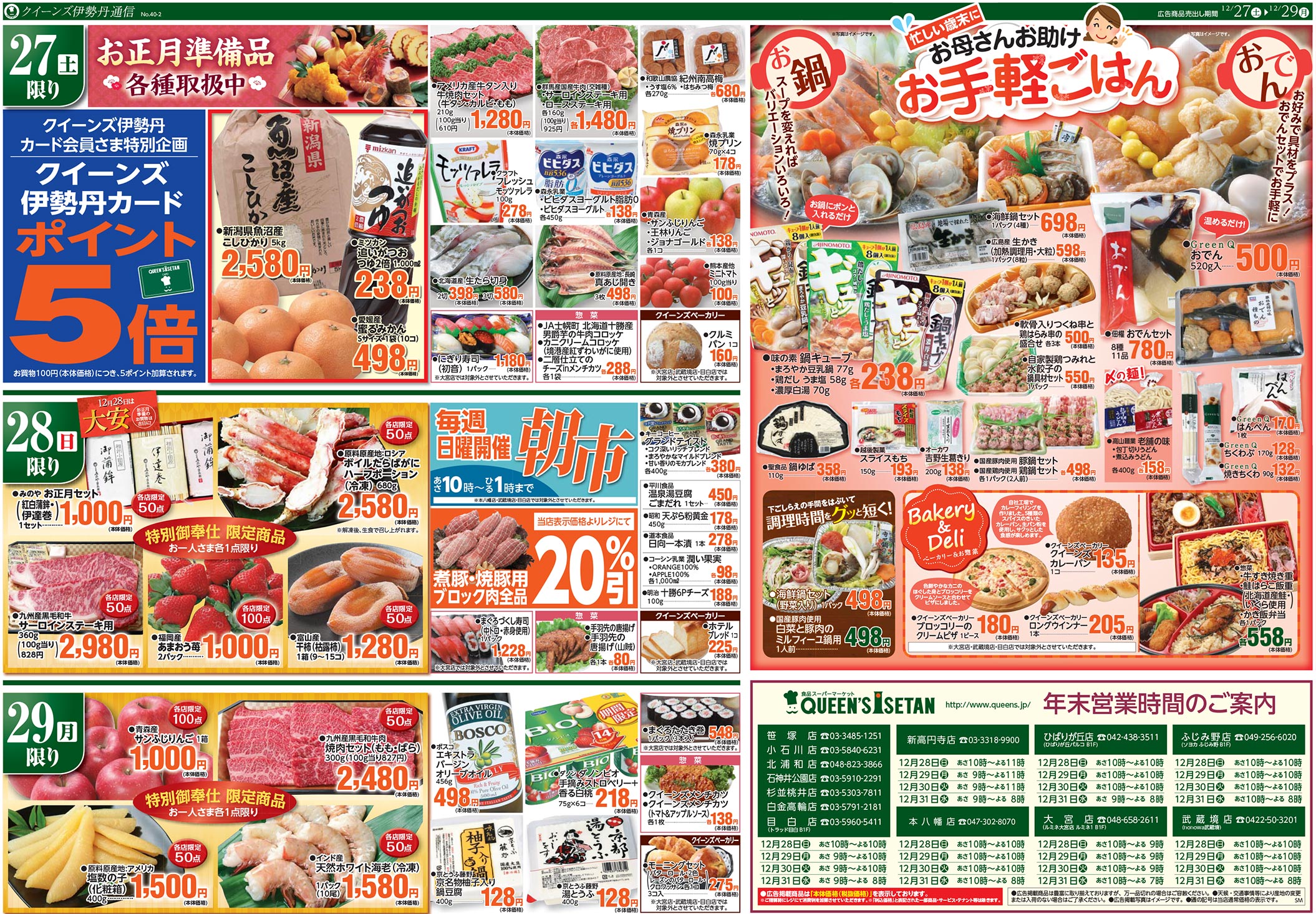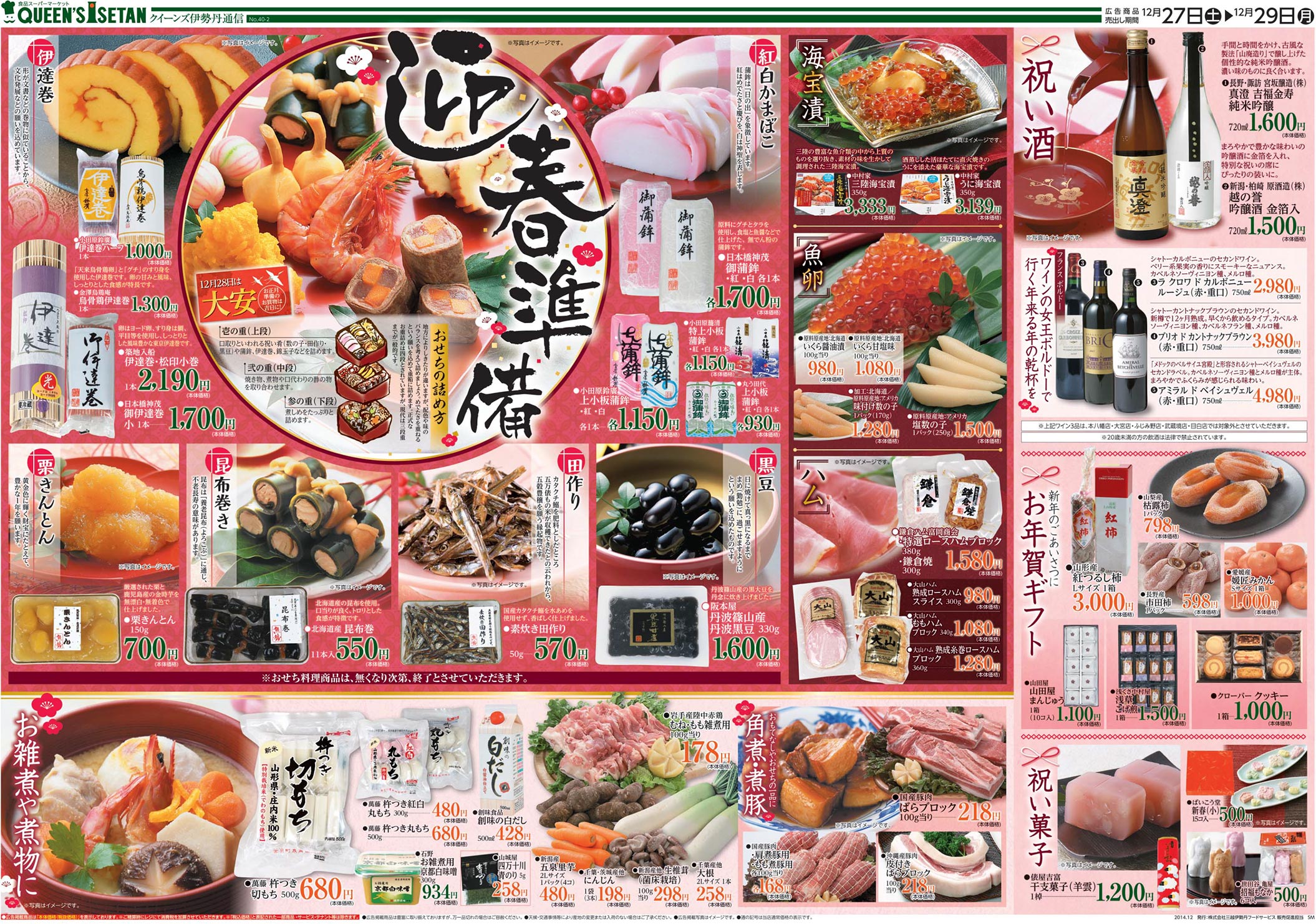 クイーンズ伊勢丹2014年12/29号(食品スーパー)のチラシ内容を紹介します。歳末を中心に、勢いな要素と手書き・筆・イラスト使用の表現で構成されたデザインです。