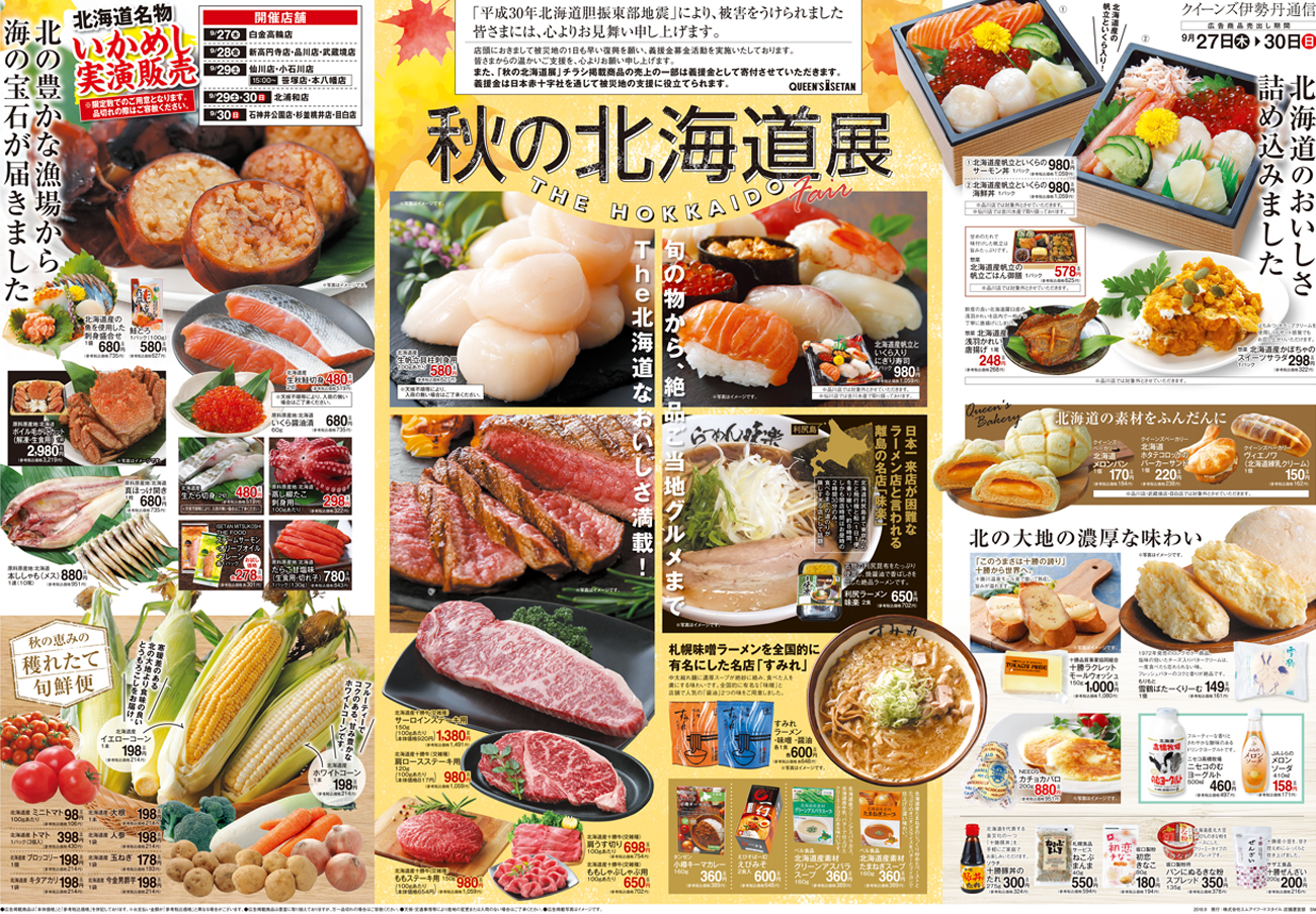 クイーンズ伊勢丹2018年9/27号(食品スーパー)のチラシでは、A 北海道を軸に商品提案がまとめられています。食品スーパーならではの視点で構成された紙面デザインが印象的です。