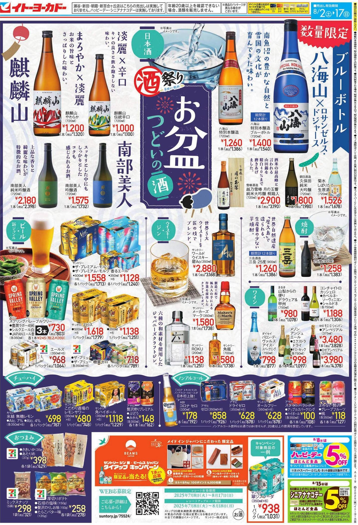イトーヨーカドー2025年8/2号(食品スーパー)のチラシでは、お盆・酒・飲料をテーマにした構成が採用されています。レトロな印象とデザインフォント・イラスト使用のデザイン表現が特徴的です。