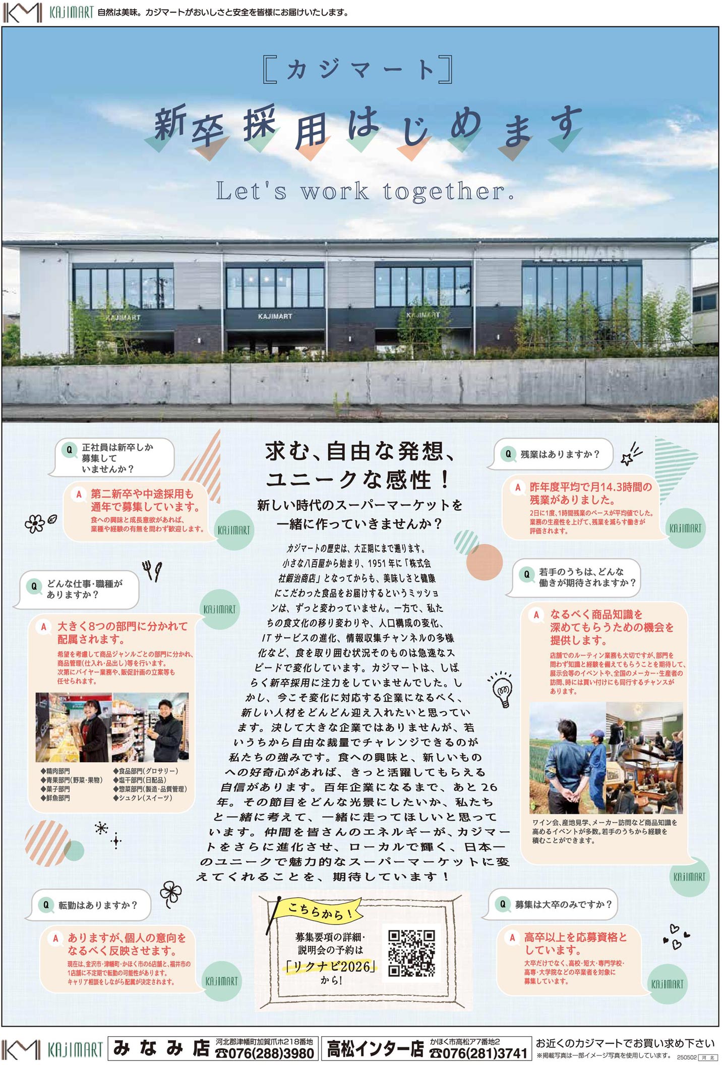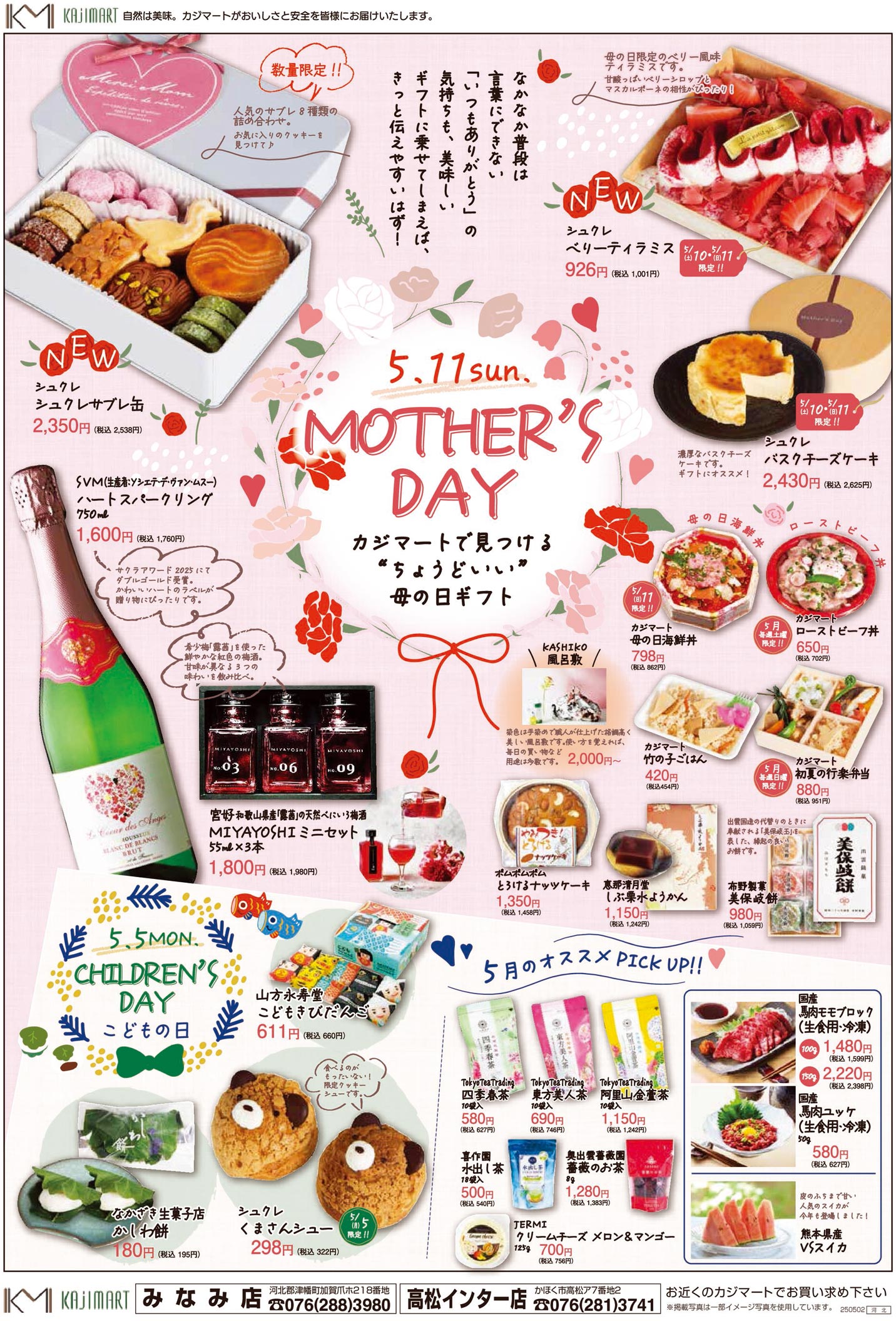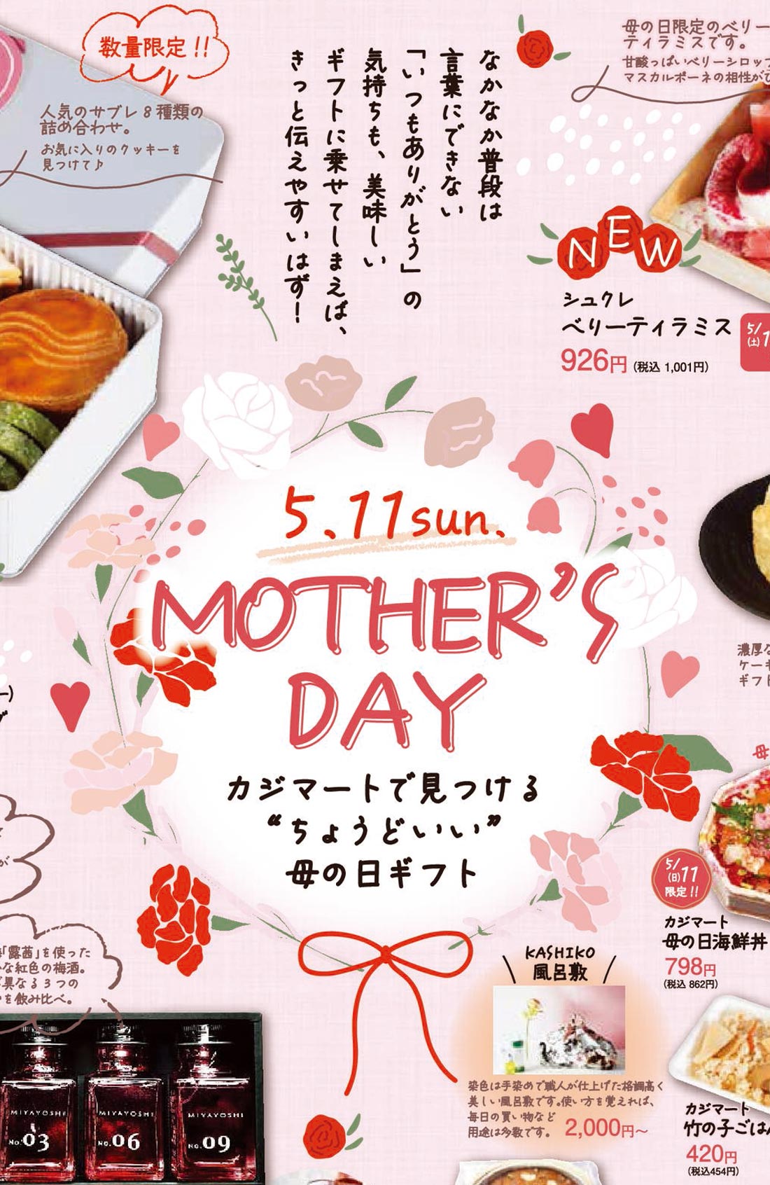 カジマート2025年5/11号(食品スーパー)のチラシでは、母の日をテーマにした構成が採用されています。シンプルな印象とデザインフォント・イラスト使用のデザイン表現が特徴的です。