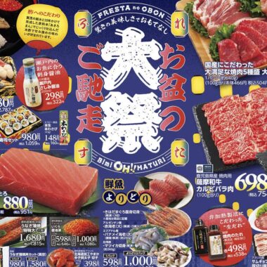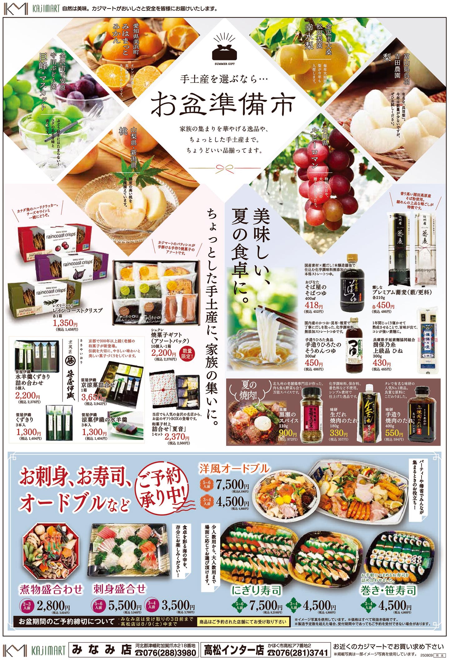 カジマート2025年8月号(食品スーパー)のチラシでは、お盆をテーマにした構成が採用されています。シンプルな印象と明朝系・写真使用のデザイン表現が特徴的です。