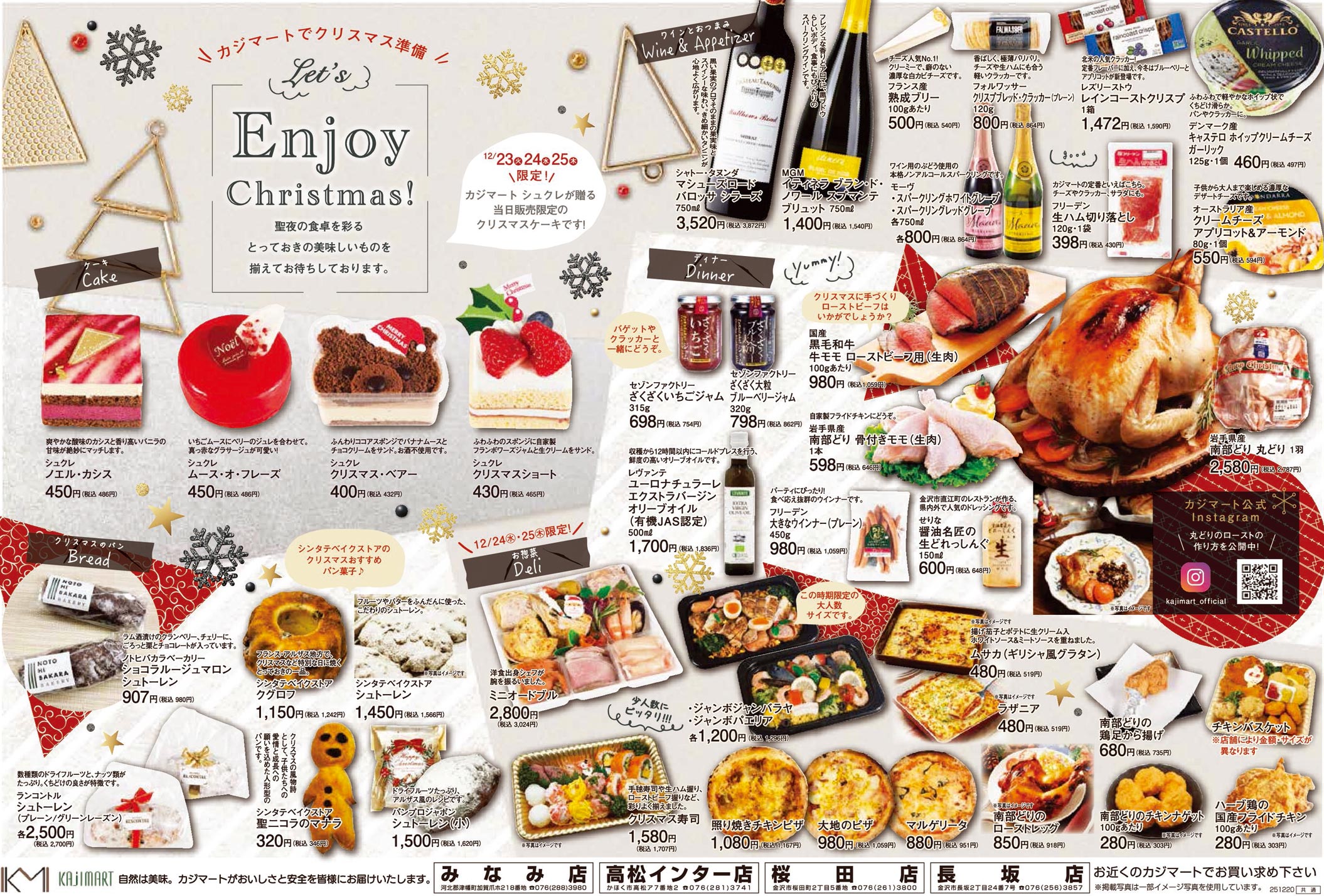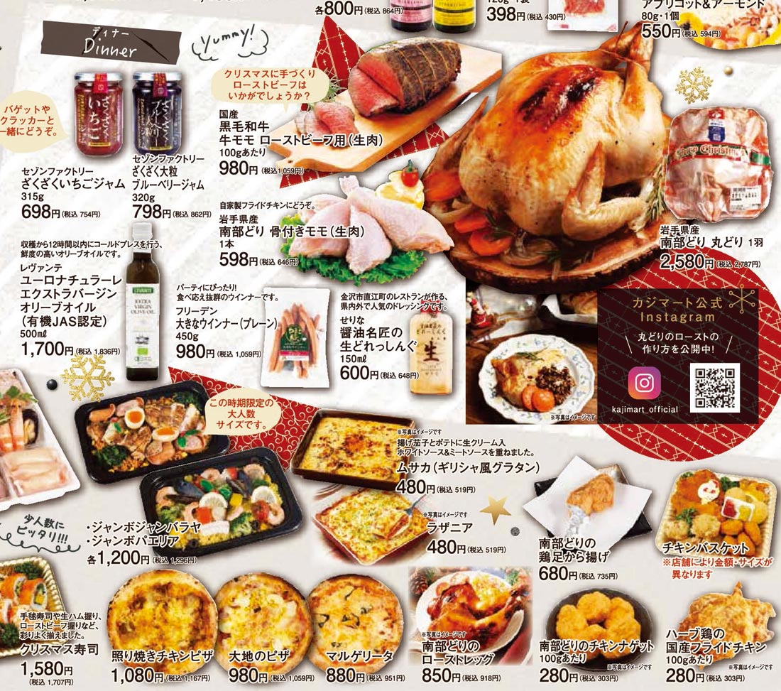 カジマート2025年12/23号(食品スーパー)のチラシ内容を紹介します。クリスマスを中心に、シンプルな要素と明朝系の表現で構成されたデザインです。
