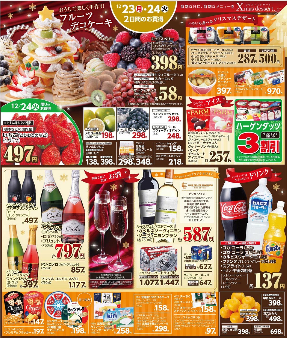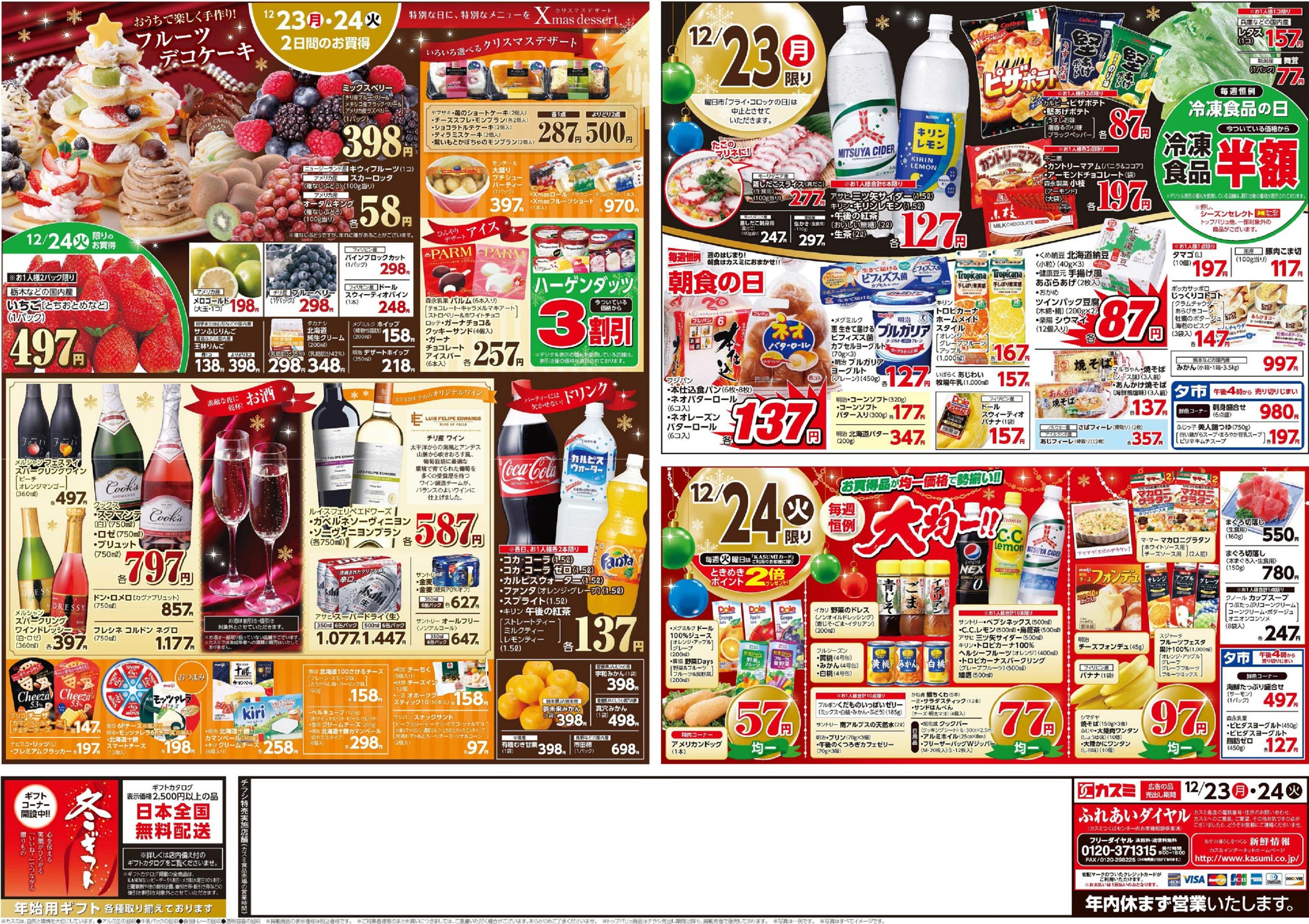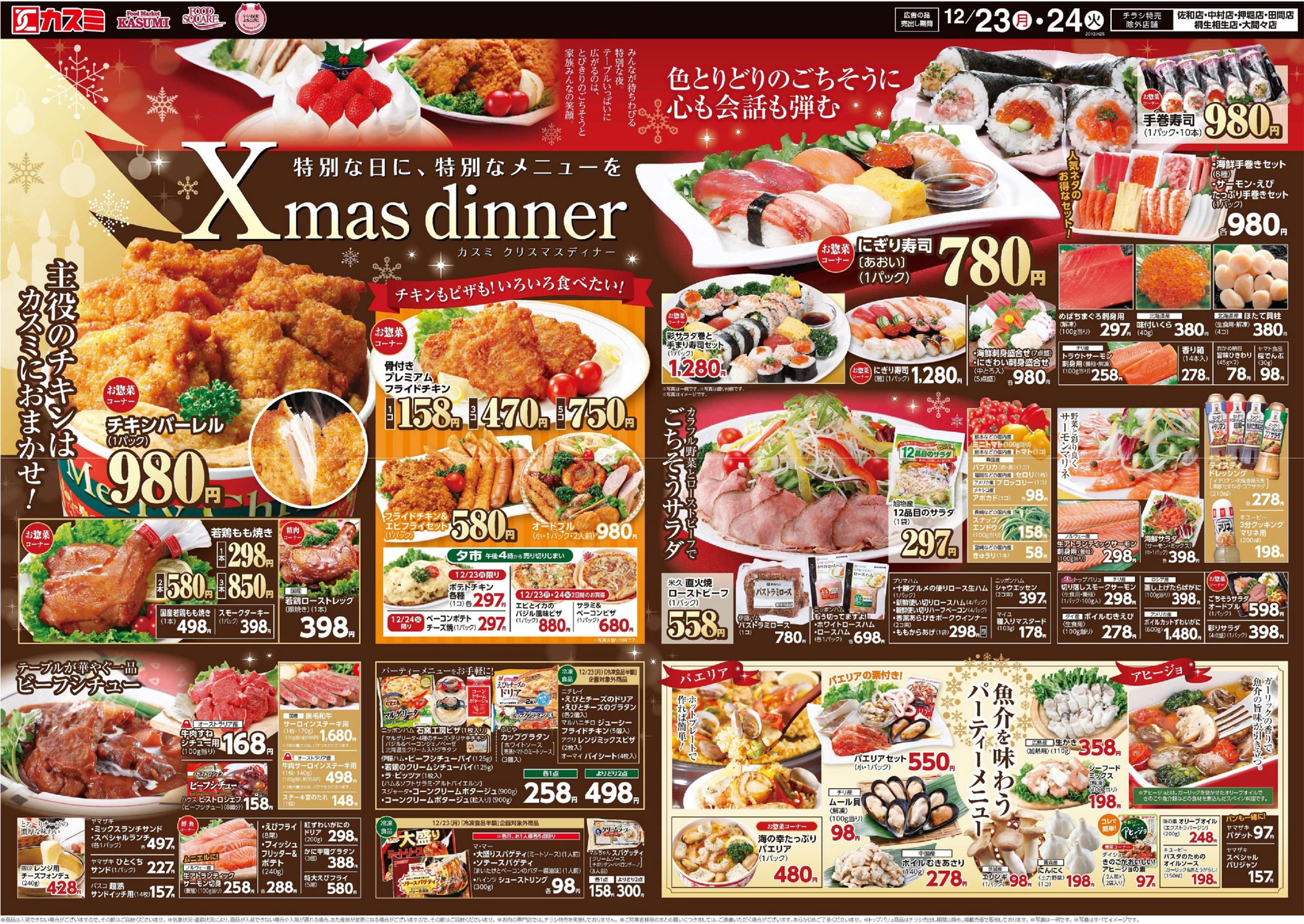カスミ2013年12/21号(食品スーパー)のチラシ内容を紹介します。クリスマスを中心に、シンプル・高級感な要素と明朝系の表現で構成されたデザインです。