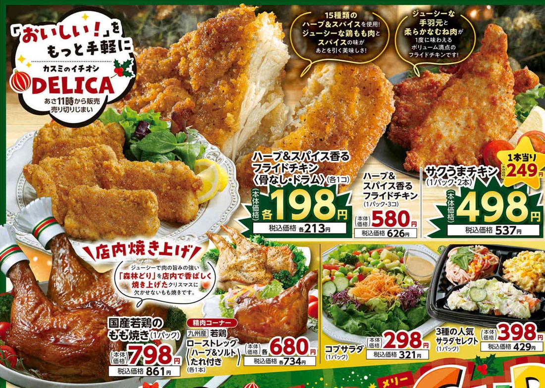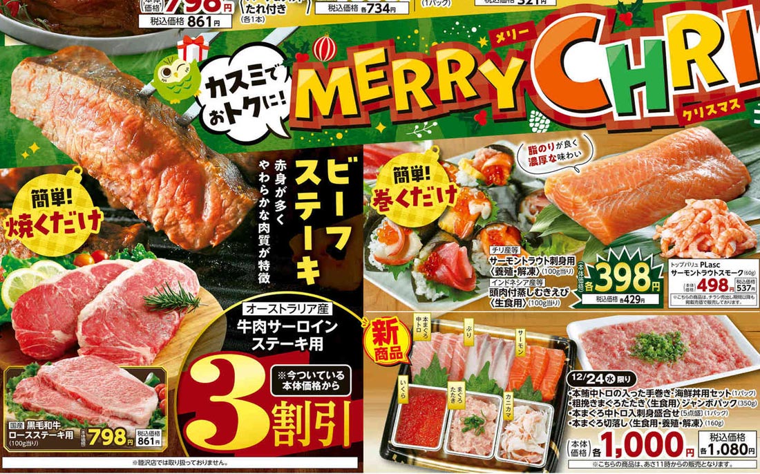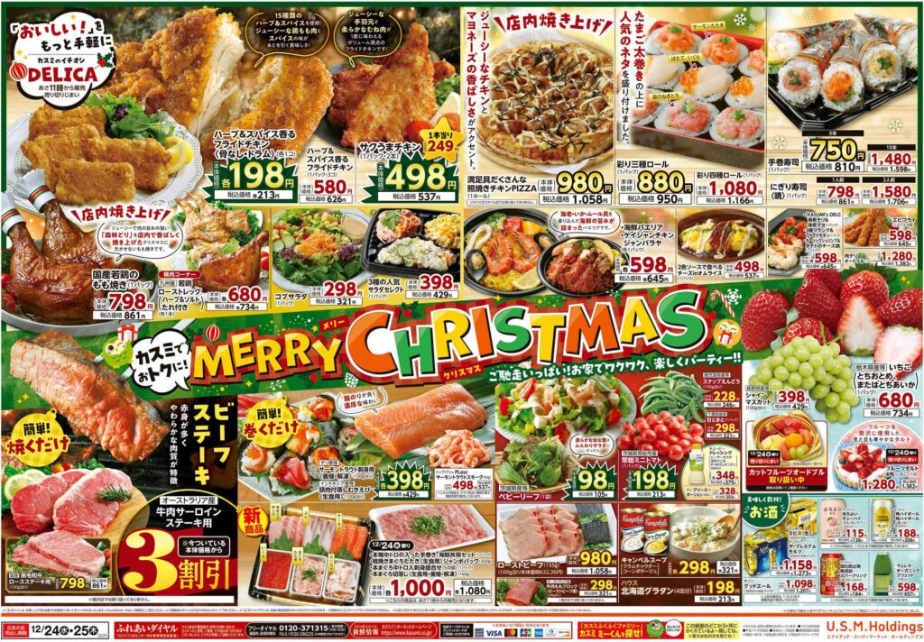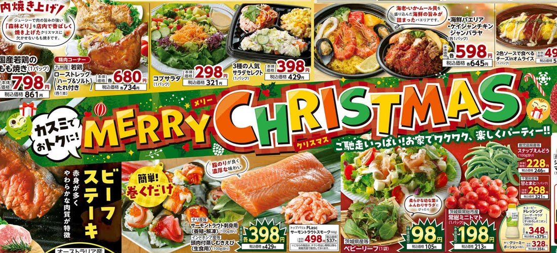 食品スーパーであるカスミ2025年12/24号のチラシです。クリスマスの企画意図が紙面構成に反映されています。