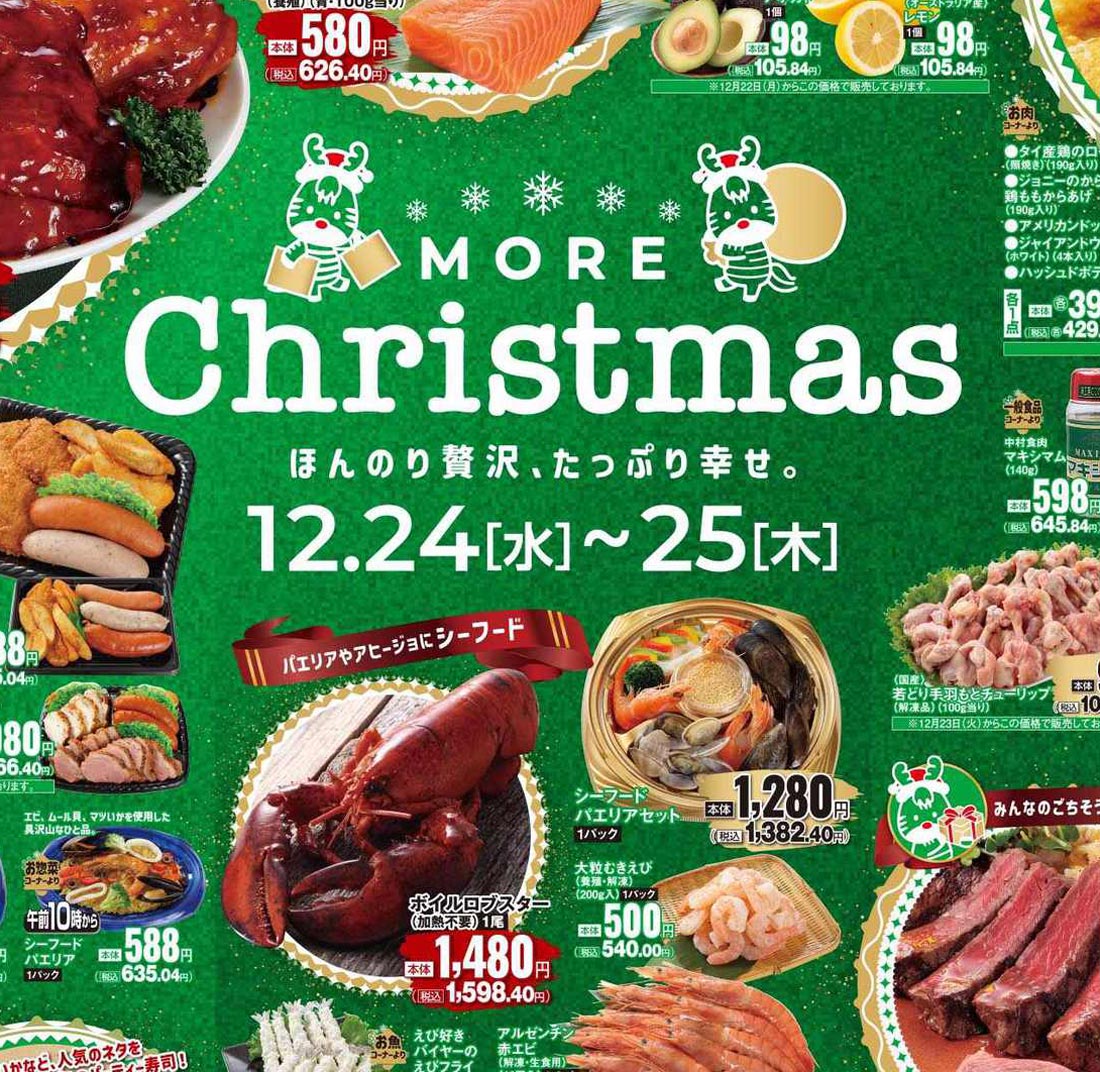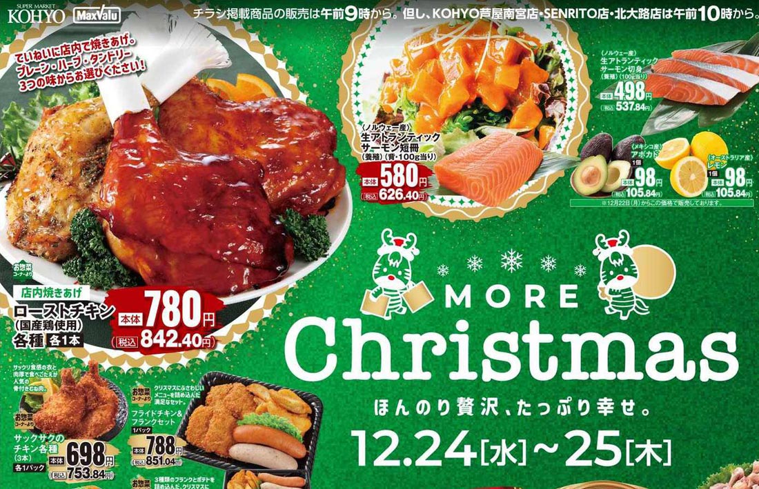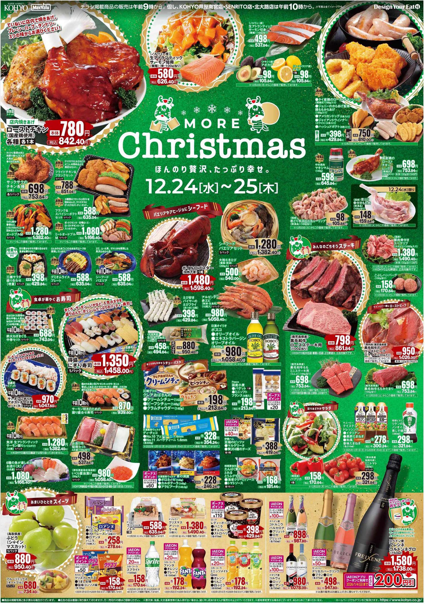 コーヨー2025年12/24号(食品スーパー)のチラシ内容を紹介します。クリスマスを中心に、シンプルな要素とゴシック系・イラスト使用の表現で構成されたデザインです。