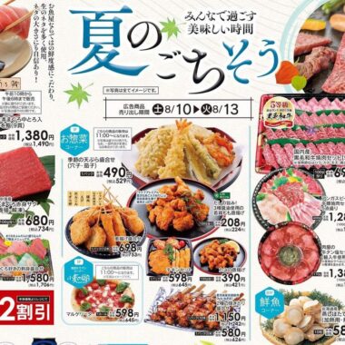 | 商品 | 桜島どりローストレッグ、フライドチキン、ピザ、サラダ、スモークサーモン、ローストビーフ、いちご、パエリア、ワイン、おせち、数の子、えび、ロースハム、かまぼこ、栗きんとん、迎春花、餅、祝い酒 |