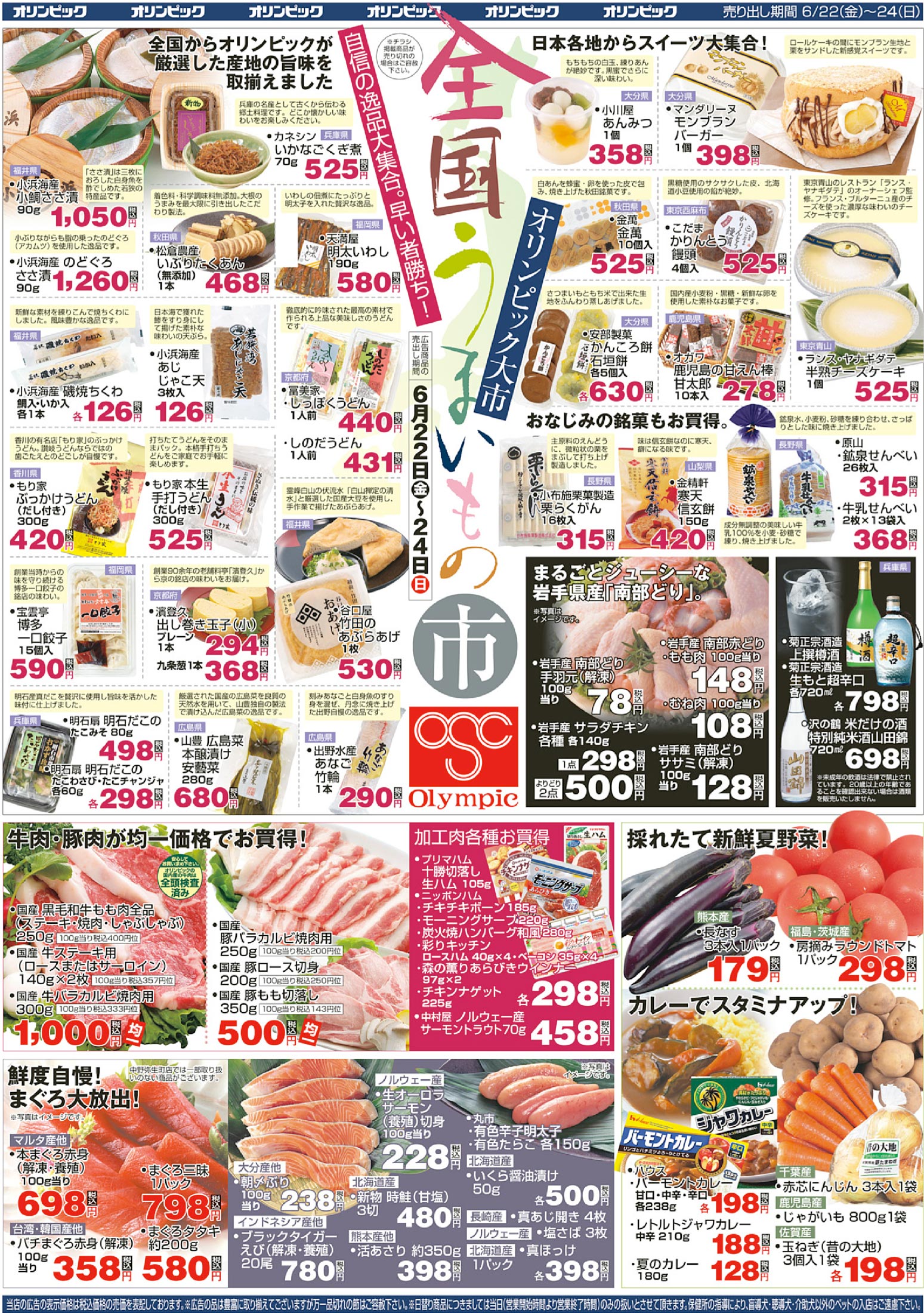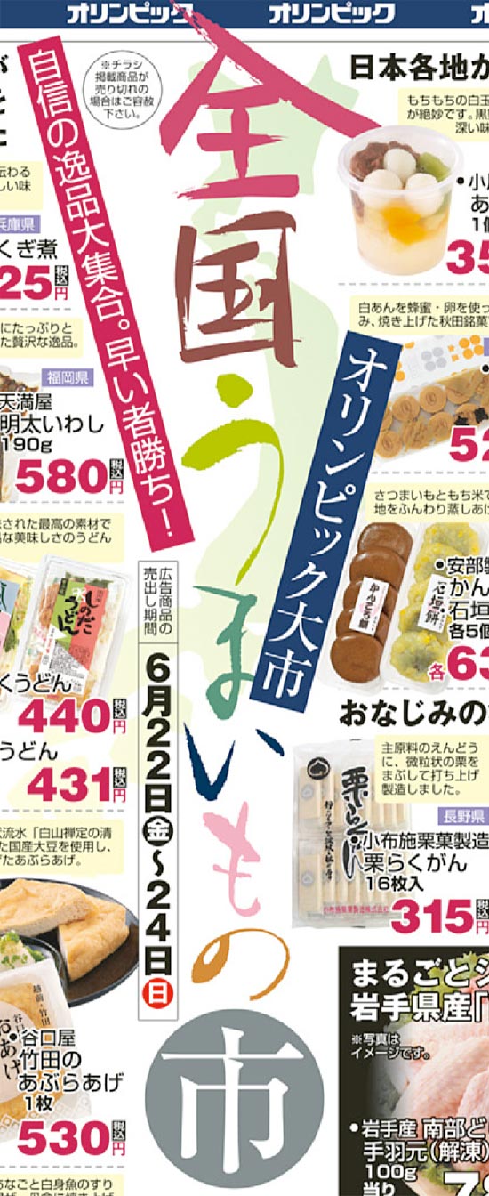 オリンピック2012年6/12号(食品スーパー)のチラシでは、全国を軸に商品提案がまとめられています。食品スーパーならではの視点で構成された紙面デザインが印象的です。