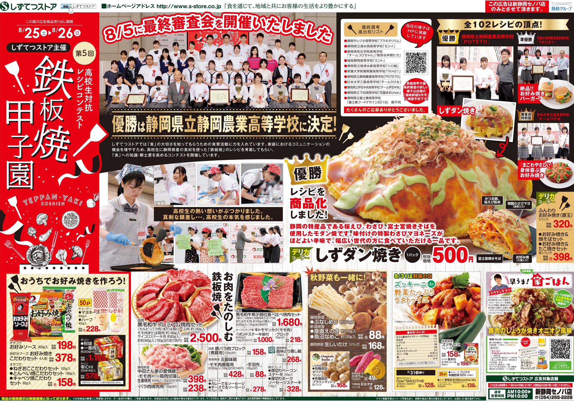 しずてつストア2018年8/25号(食品スーパー)のチラシです。大会・鉄板焼きをテーマに、スタイリッシュなビジュアルと明朝系・イラスト使用・人物のデザインが特徴です。