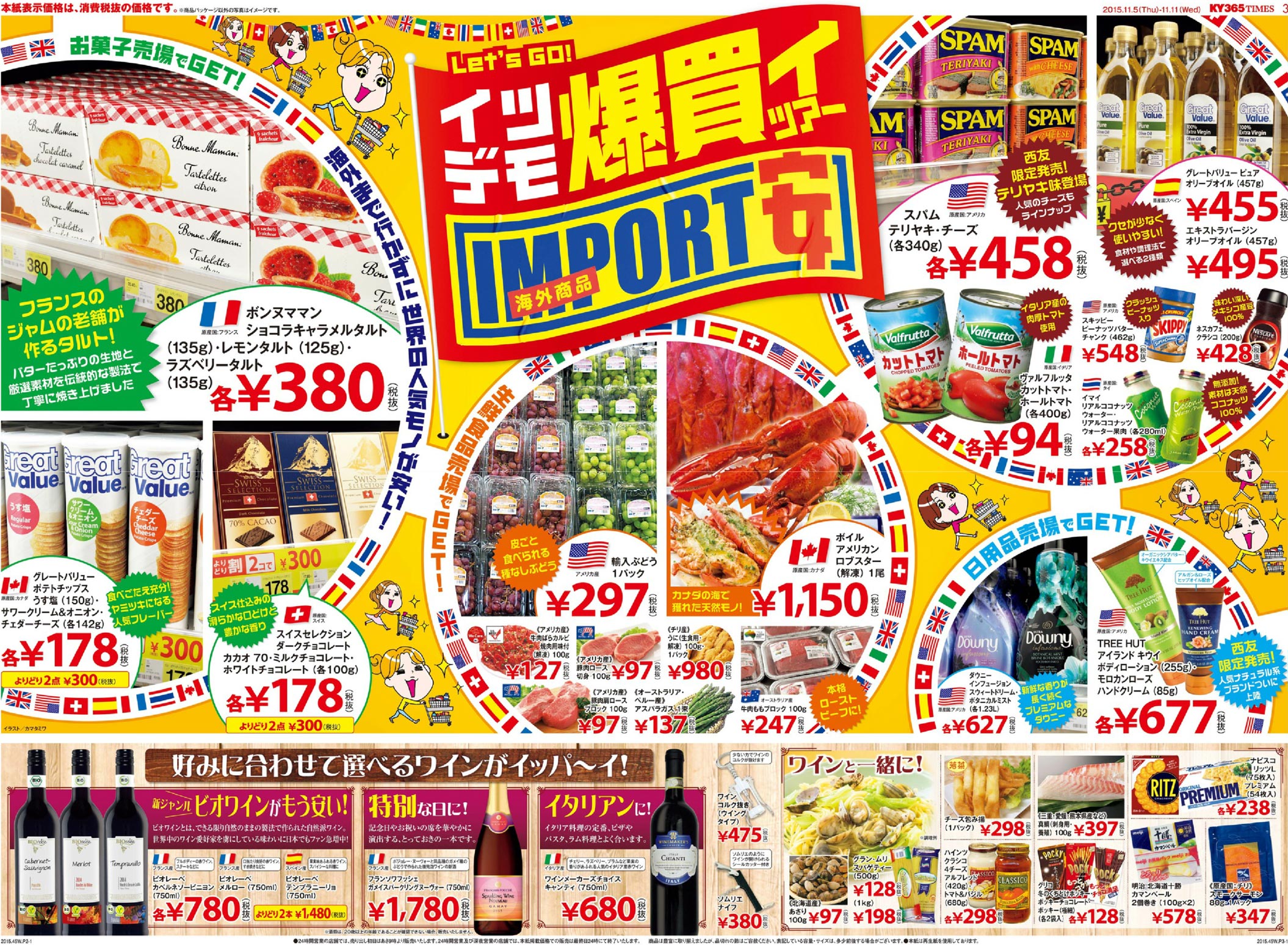 西友2015年11/5号(食品スーパー)のチラシ内容を紹介します。K 海外を中心に、ポップな要素とゴシック系・イラスト使用の表現で構成されたデザインです。