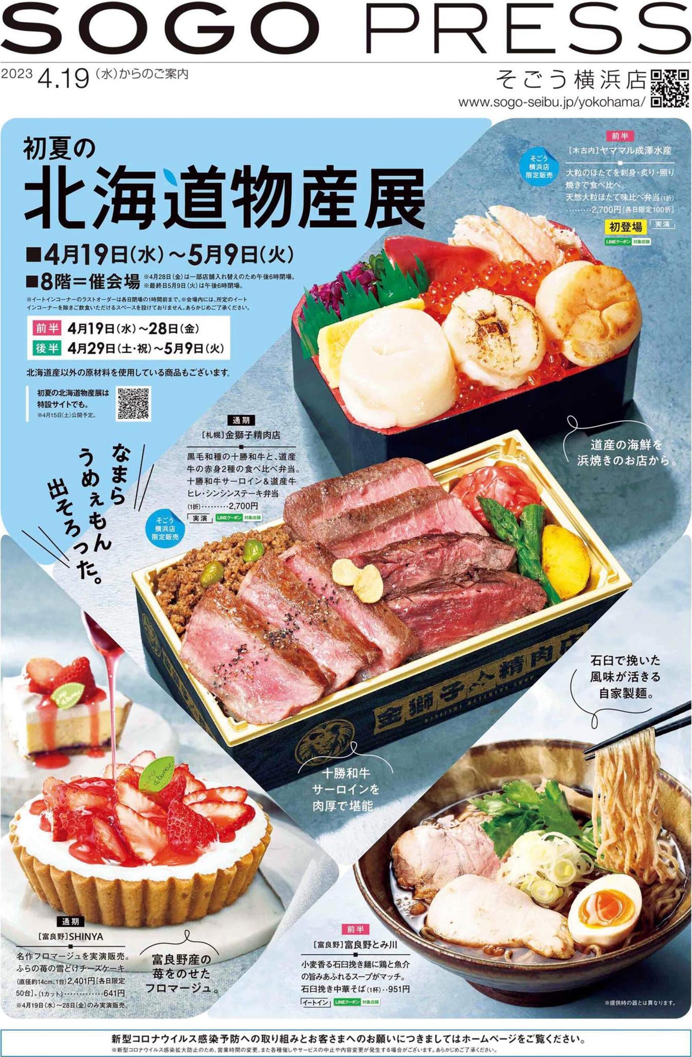 そごう横浜店2023年4/19号(百貨店)のチラシでは、A 北海道をテーマにした構成が採用されています。シンプルな印象とゴシック系のデザイン表現が特徴的です。