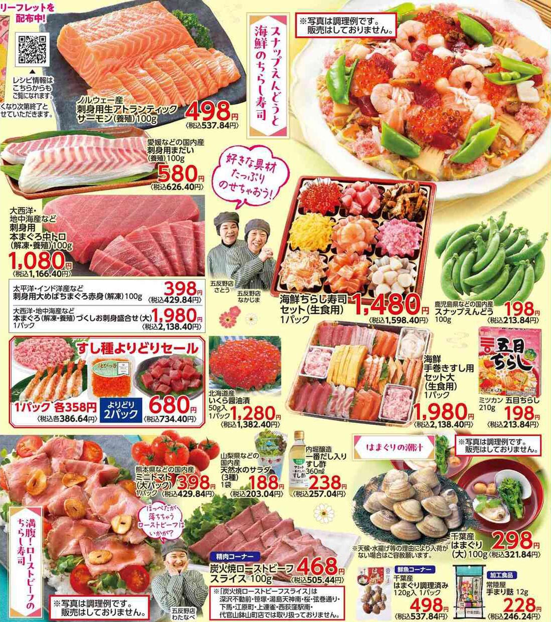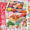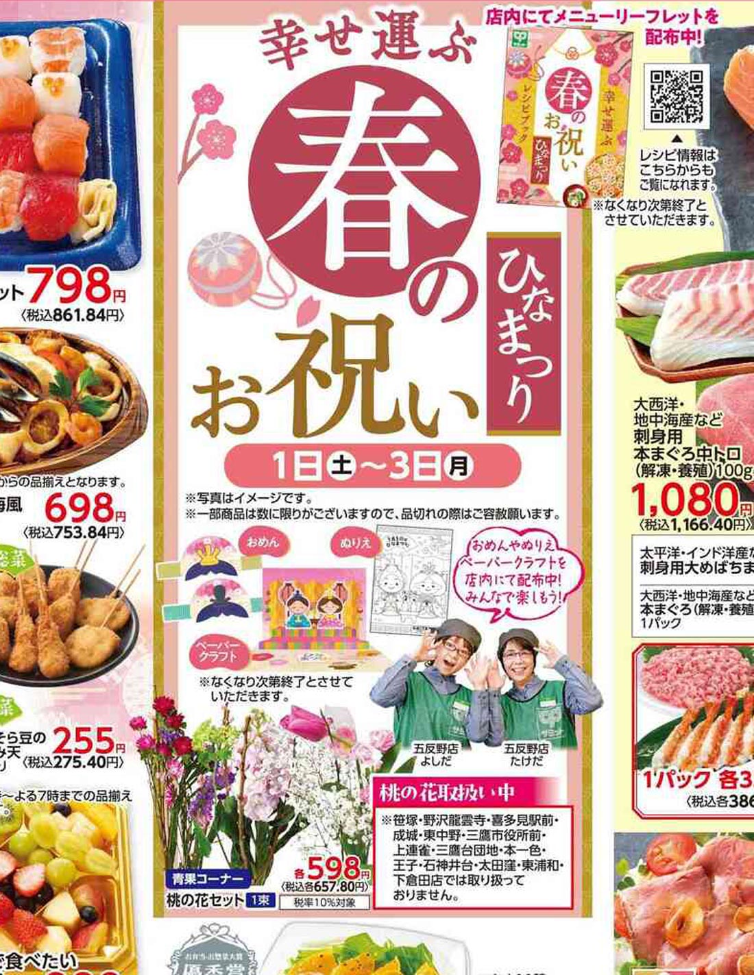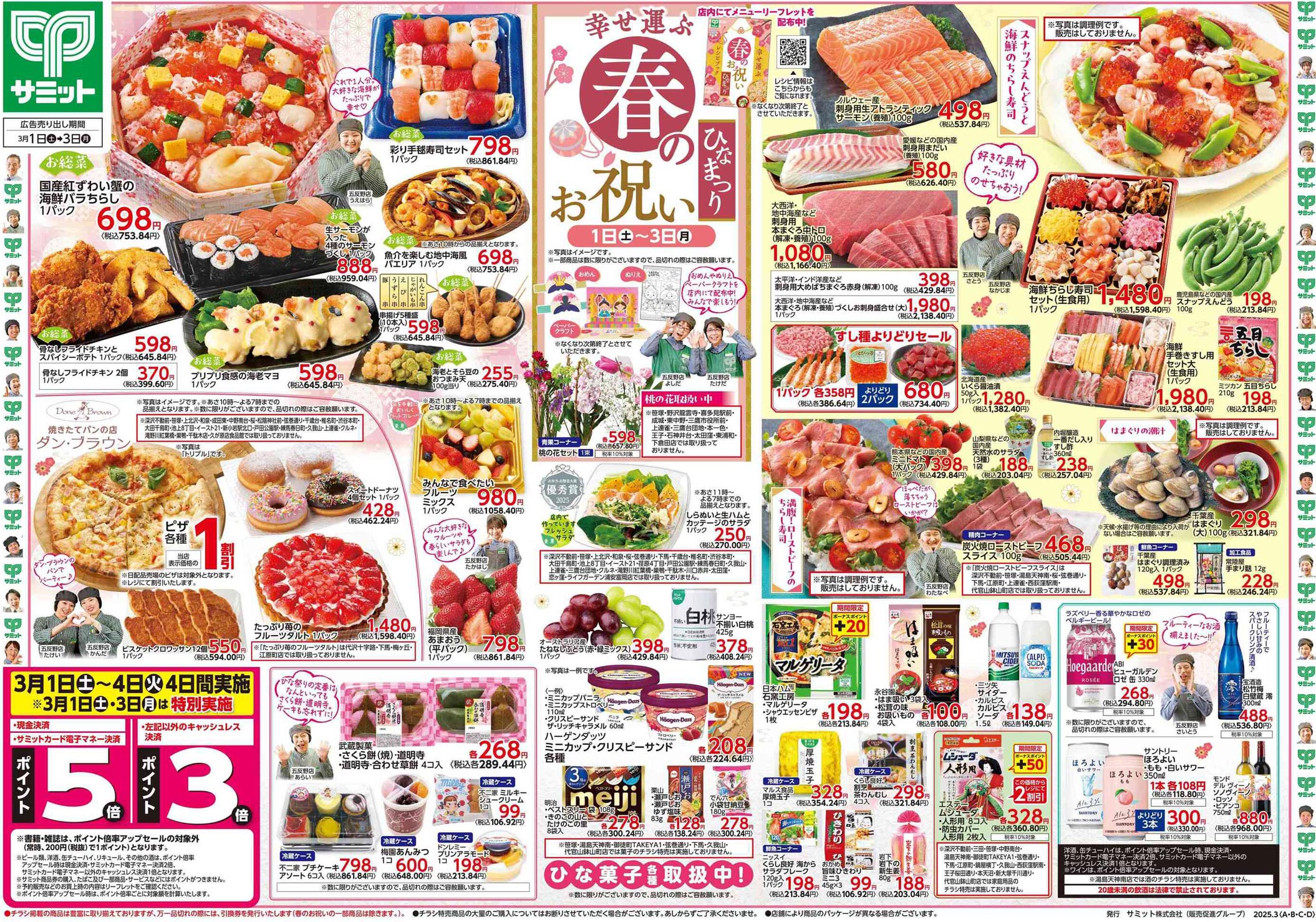 食品スーパーであるサミット2025年3/1号のチラシです。ひな祭りの企画意図が紙面構成に反映されています。