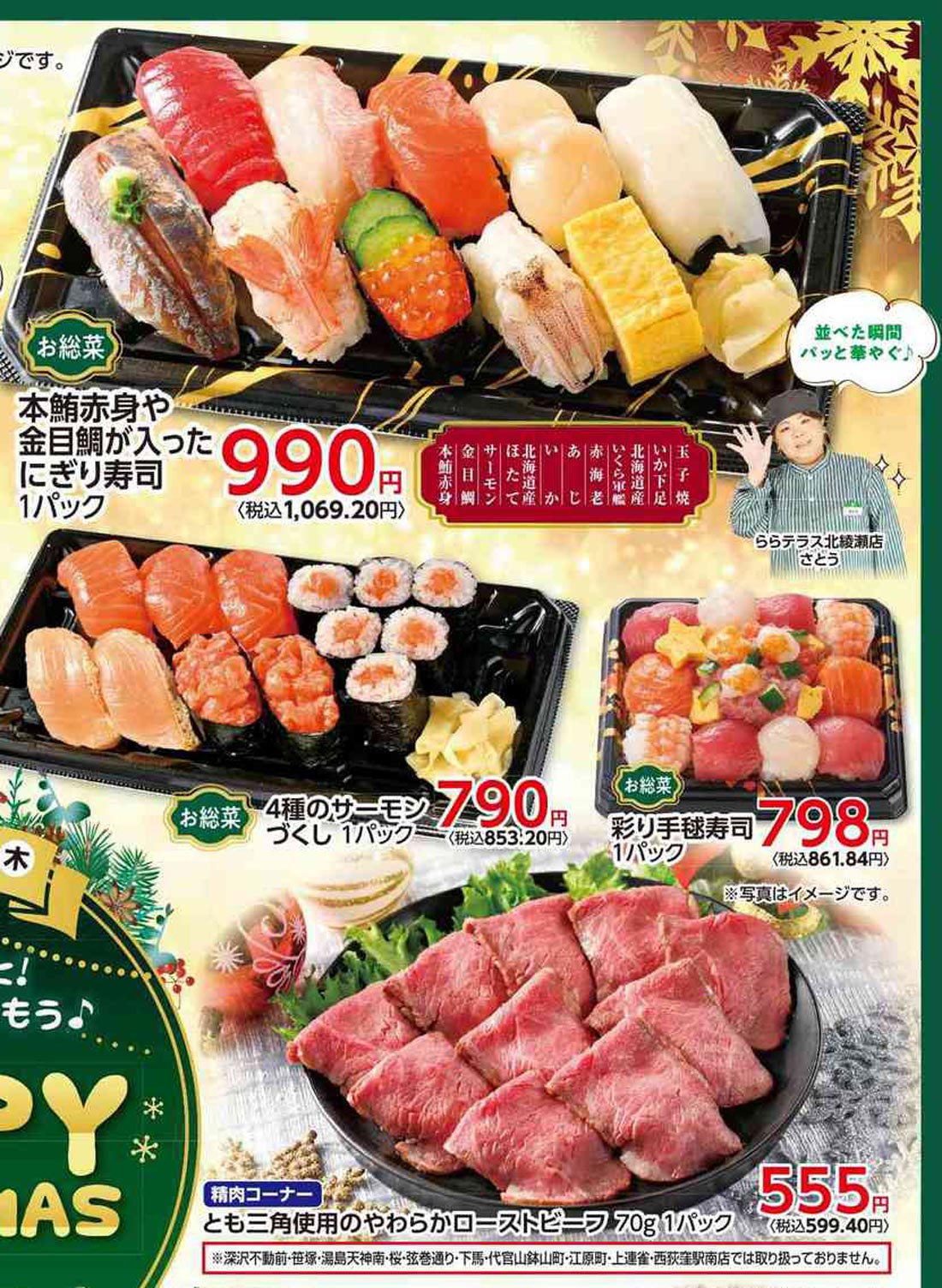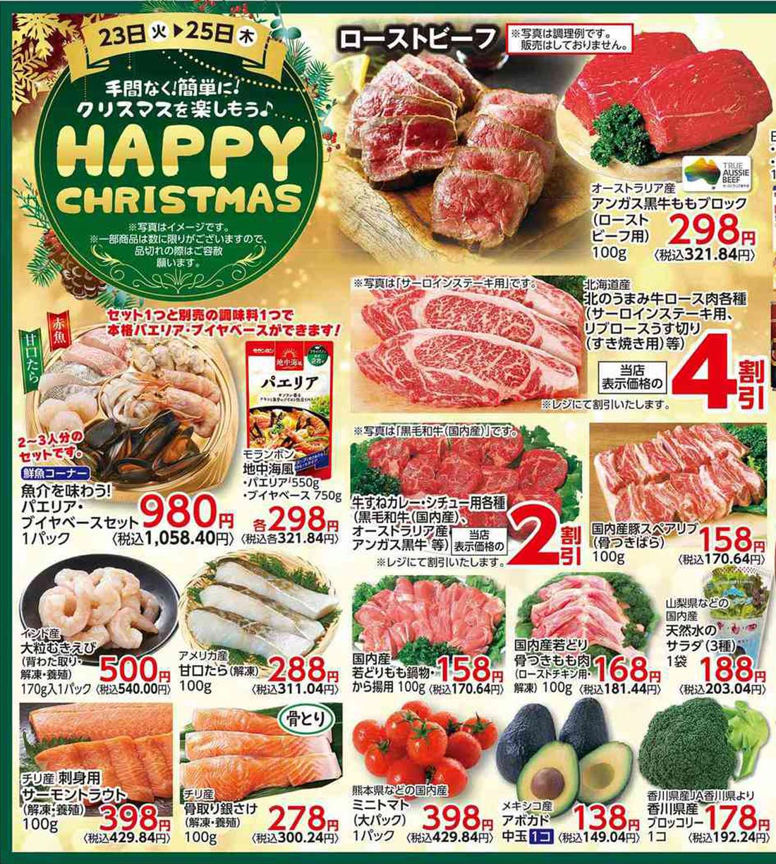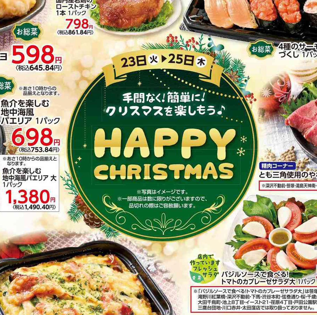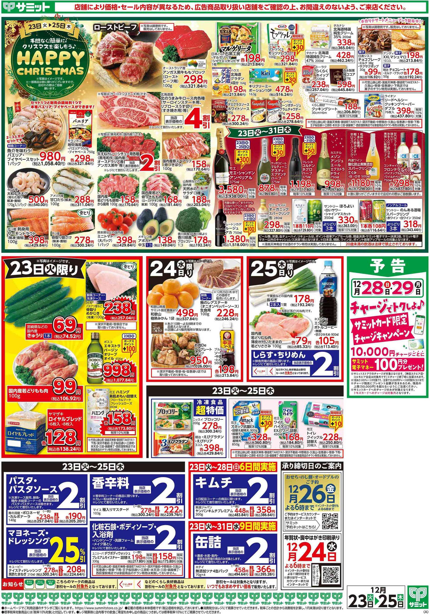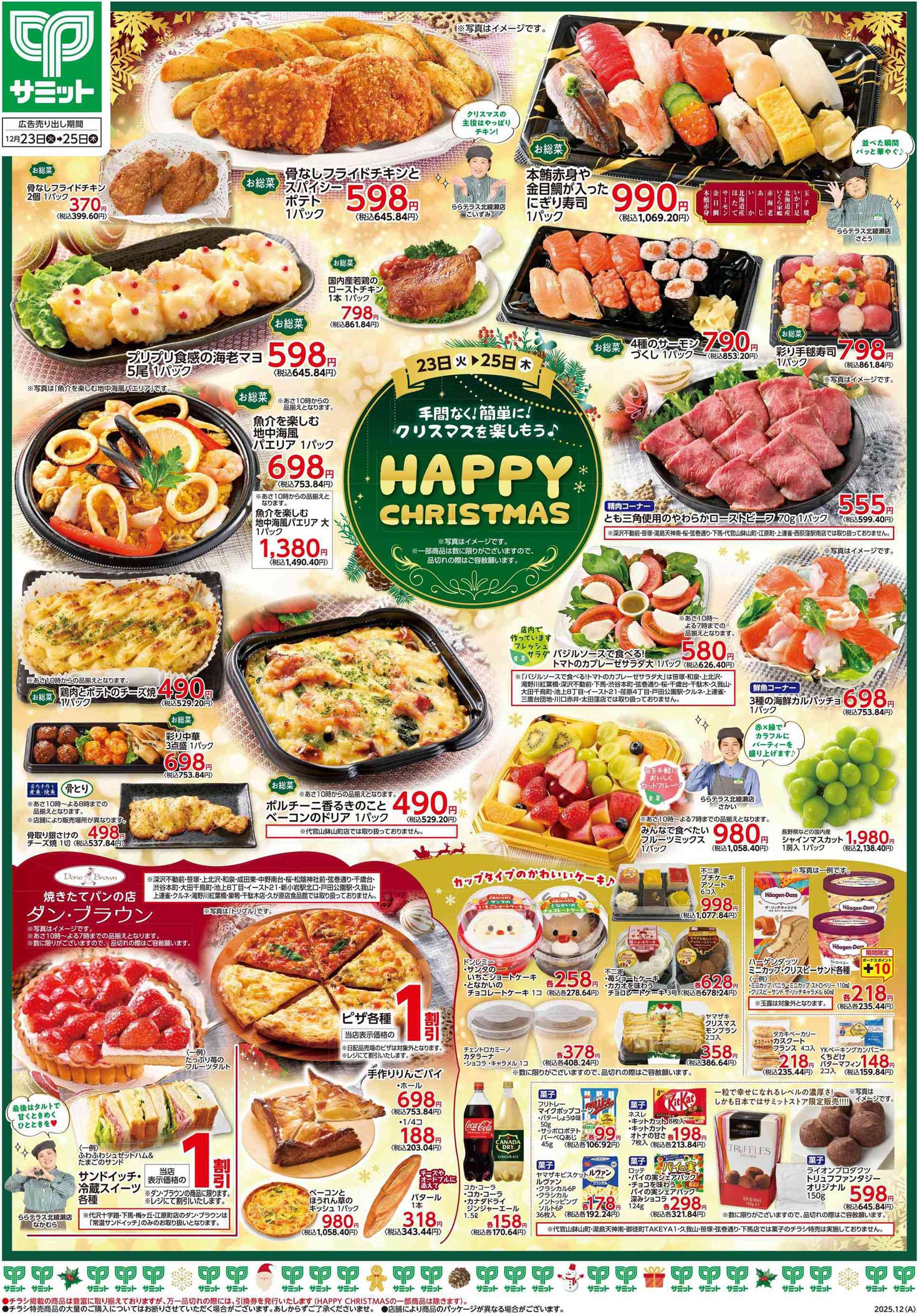 サミット2025年12/23号(食品スーパー)のチラシです。クリスマスをテーマに、ポップ・高級感なビジュアルとデザインフォント・イラスト使用・人物のデザインが特徴です。