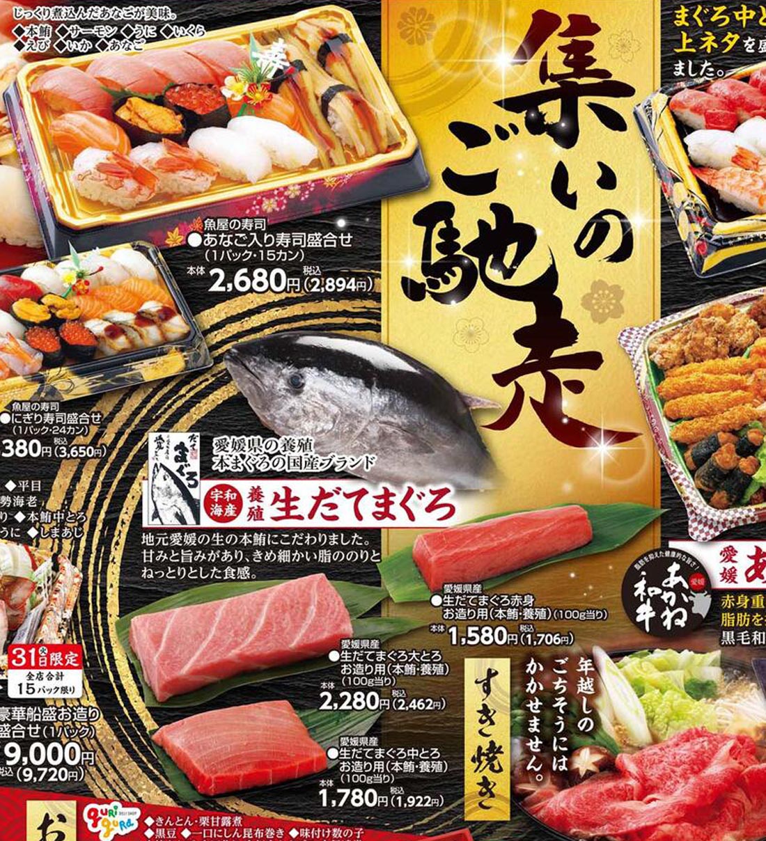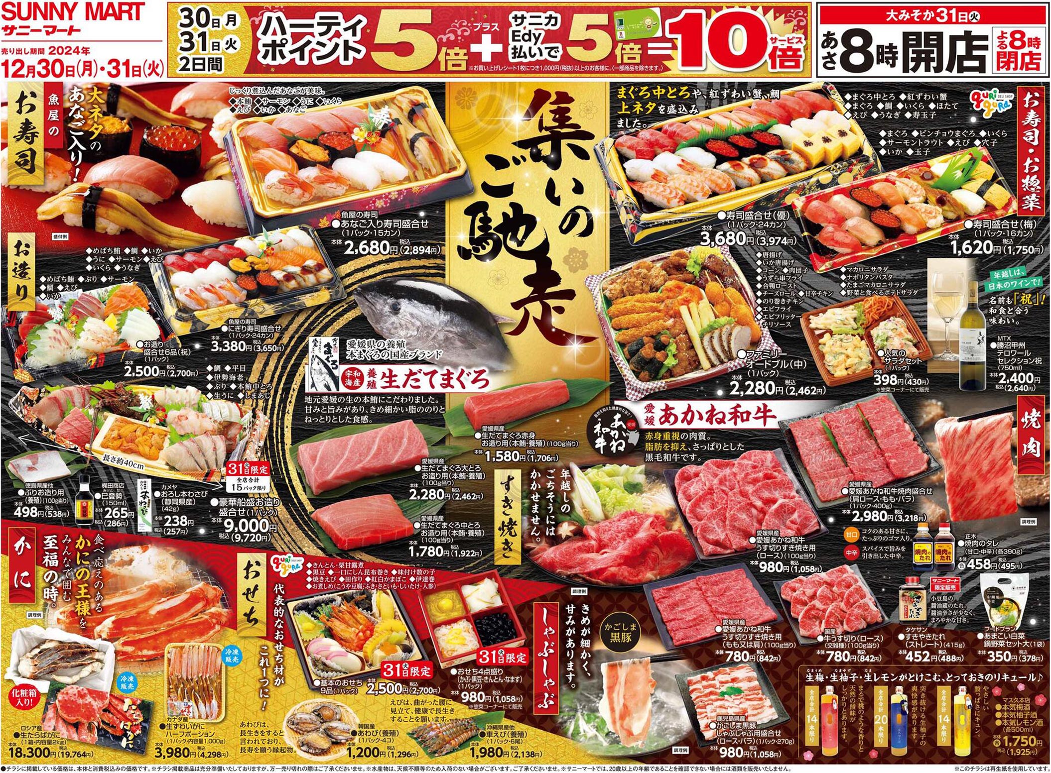 サニーマート2024年12/30号(食品スーパー)のチラシです。歳末をテーマに、スタイリッシュ・高級感なビジュアルと手書き・筆のデザインが特徴です。