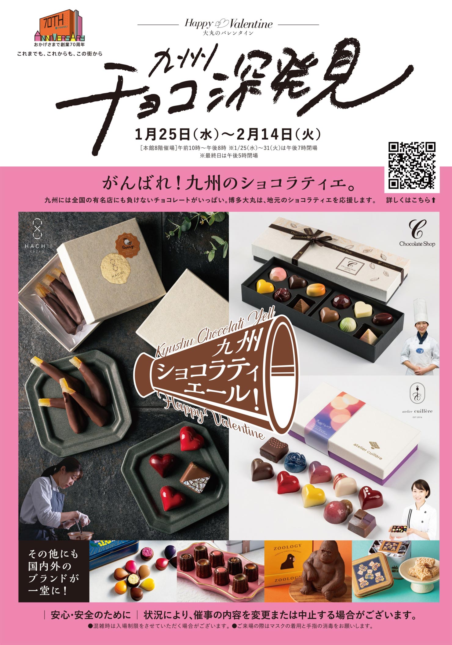 | キャッチコピー | ●九州には全国の有名店にも負けないチョコレートがいっぱい。博多大丸は、地元のショコラティエを応援します。 ●那須御養卵のコクと、きび糖のやさしい甘さ。 ●発酵バターの香りが広がるバターサンド。 ●1粒ごとにときめく!多彩な輝きを放つ贅沢な2段ボックス。 ●今年のテーマは「Touching hearts」。 ●九州の凄腕ショコラティエが続々登場! ●ドキドキと、心ときめくスイーツがいっぱい。 ●激カワイイ!クッキー缶が人気! ●お口の中で溶けちゃう~ |
