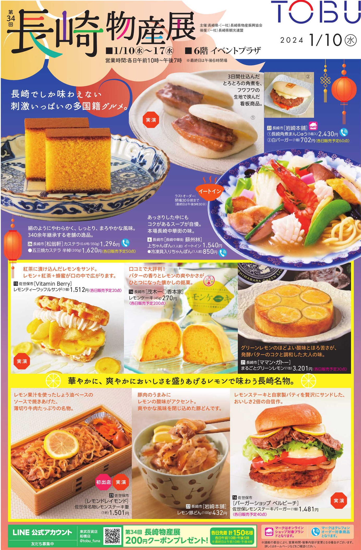 東武船橋2024年1/10号(百貨店)のチラシ内容を紹介します。長崎を中心に、スタイリッシュな要素と明朝系・イラスト使用の表現で構成されたデザインです。