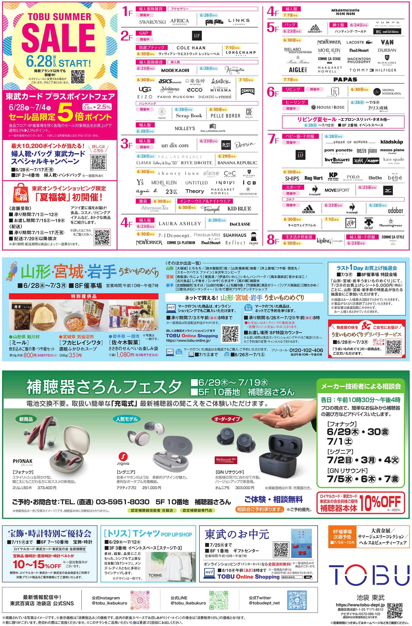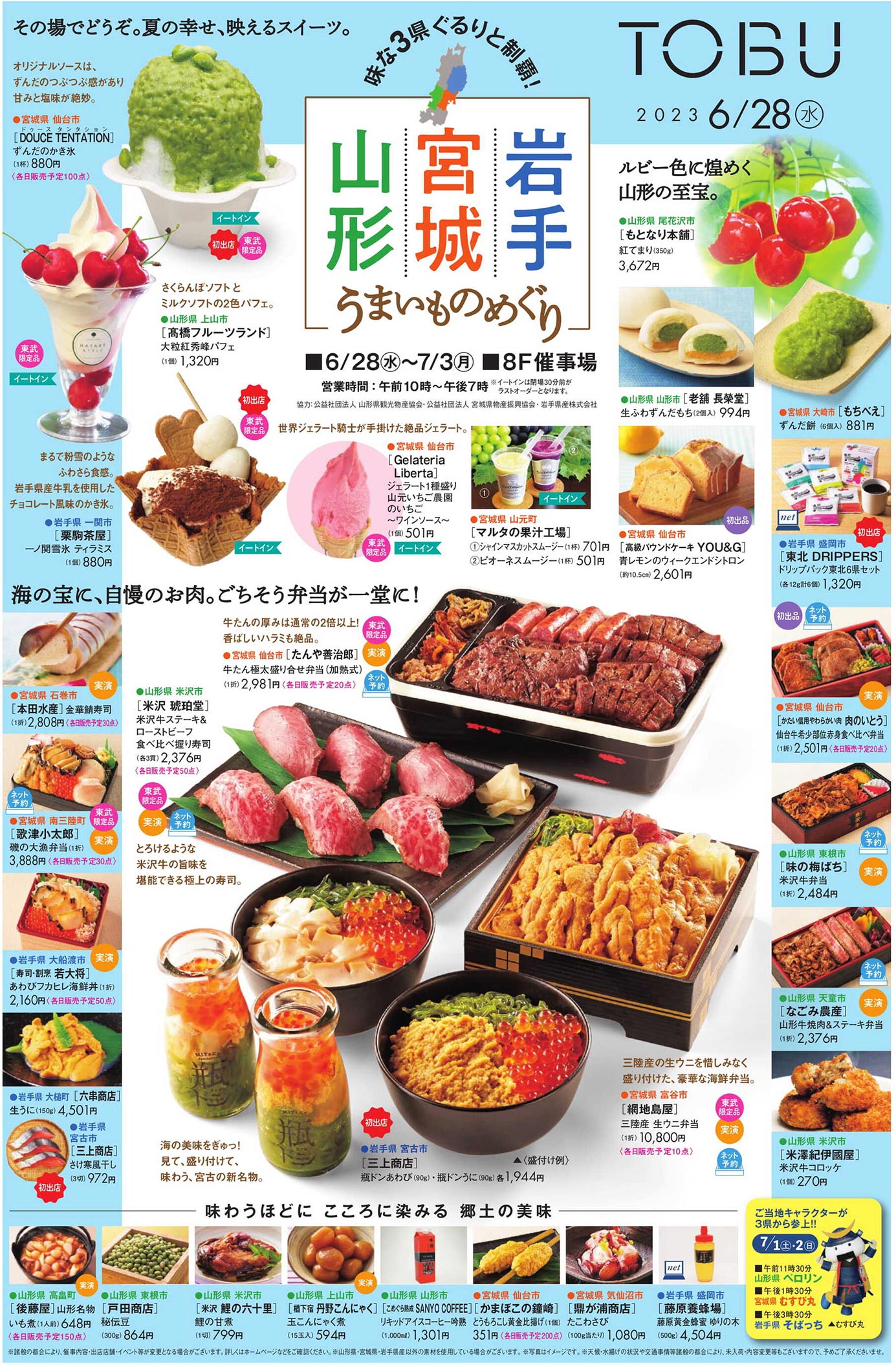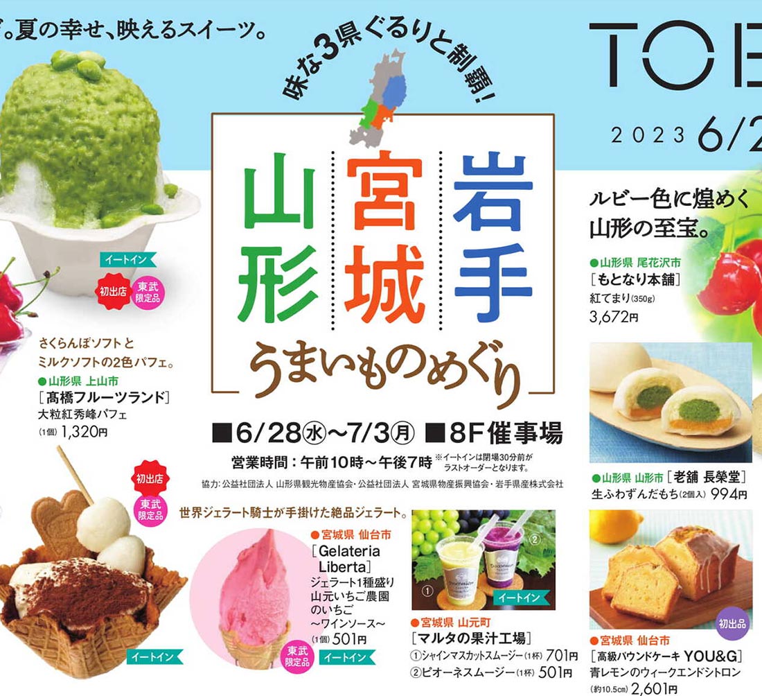 東武池袋2023年6/28号(百貨店)のチラシです。岩手・山形・宮城をテーマに、シンプルなビジュアルとゴシック系のデザインが特徴です。