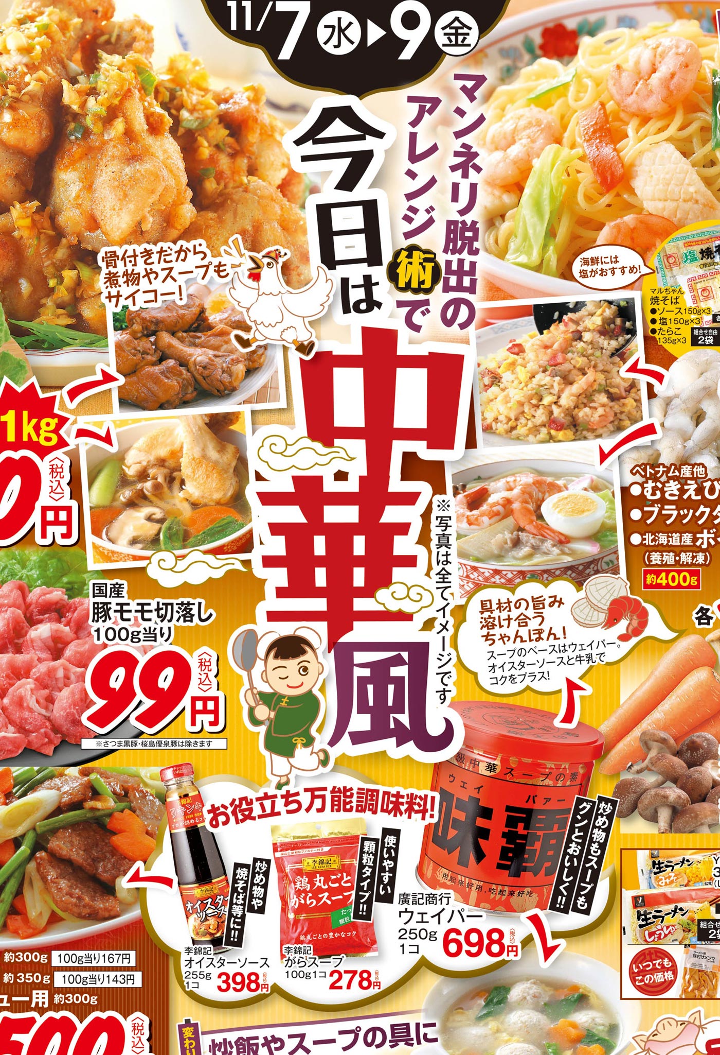 ヤオコー2012年11/7号(食品スーパー)のチラシでは、中華を軸に商品提案がまとめられています。食品スーパーならではの視点で構成された紙面デザインが印象的です。