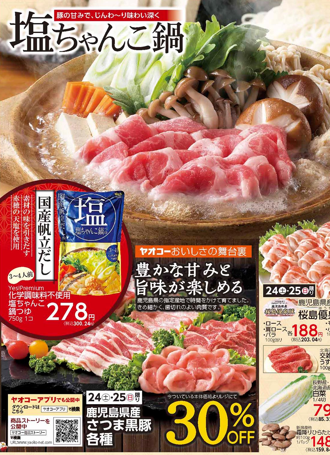 ヤオコー2020年10/24号(食品スーパー)のチラシでは、調味料・油・鍋をテーマにした構成が採用されています。スタイリッシュ・和風・高級感な印象と明朝系・写真使用のデザイン表現が特徴的です。